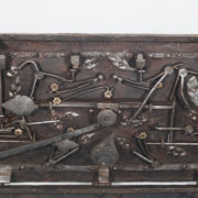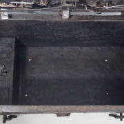 Équipé d’un ingénieux système de fermeture à 7 pênes et 3 crochets, avec fausse et vraie serrure dissimulées ainsi que 2 cadenas (postérieurs marque Fichet)) en façade avec clés