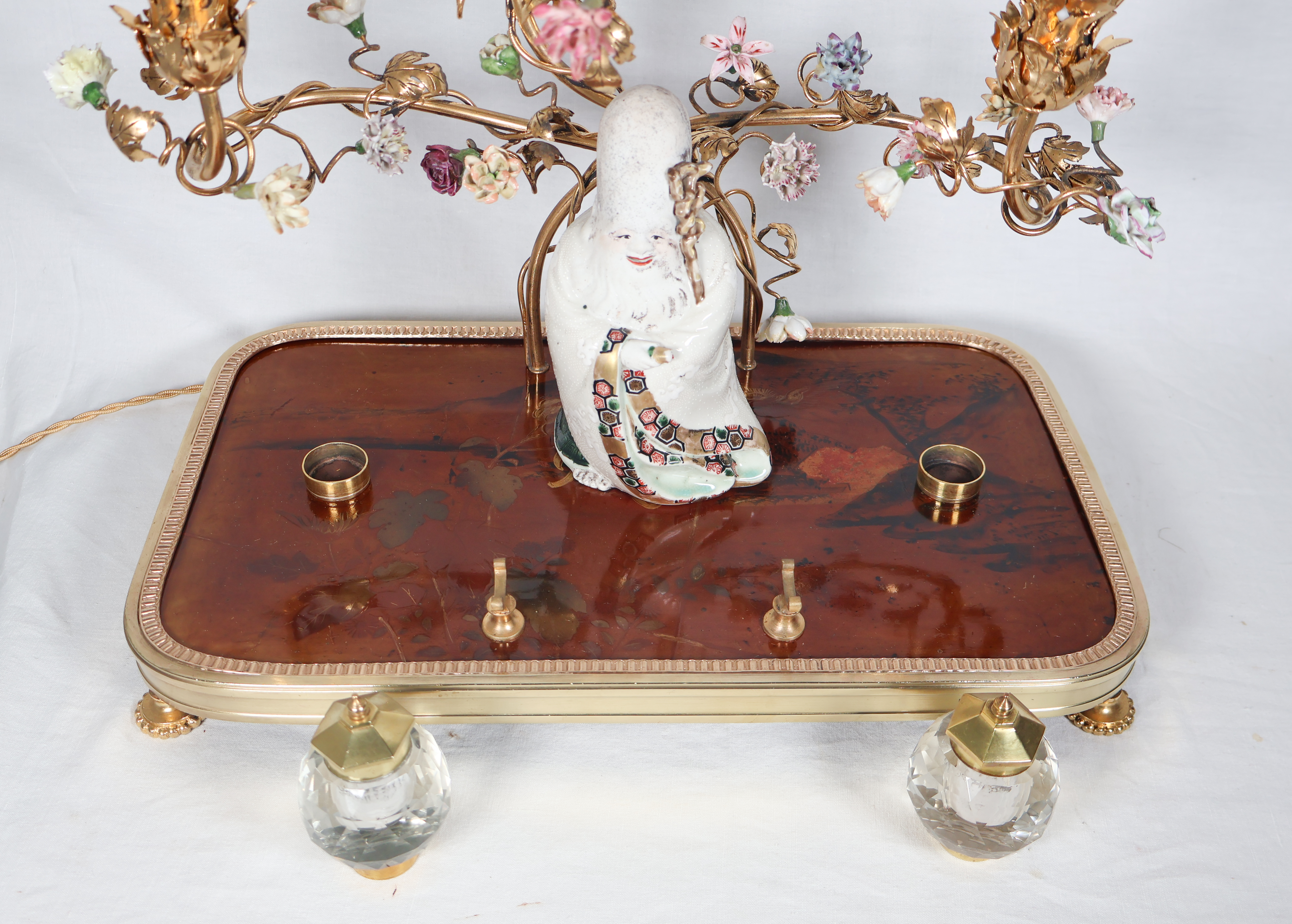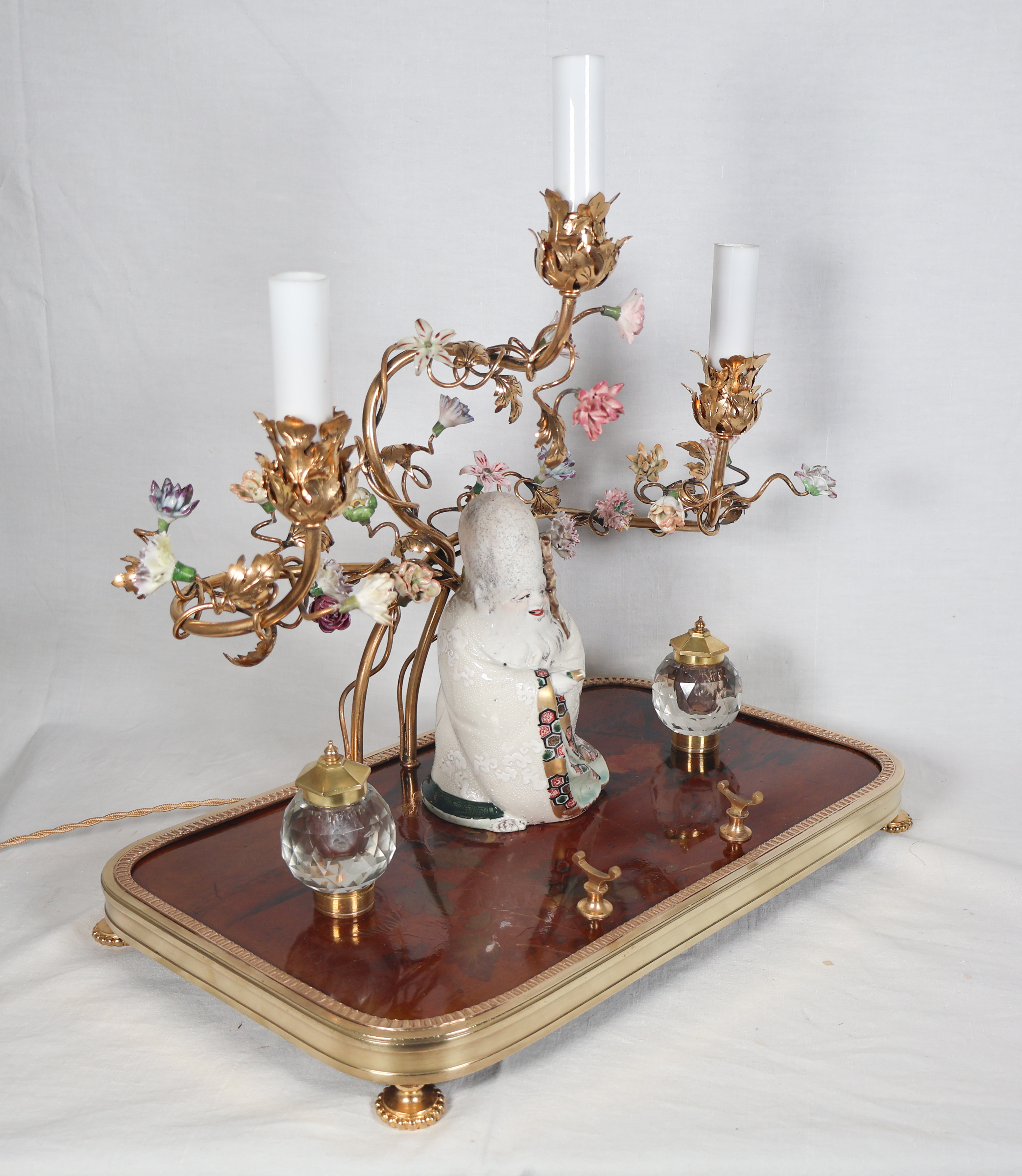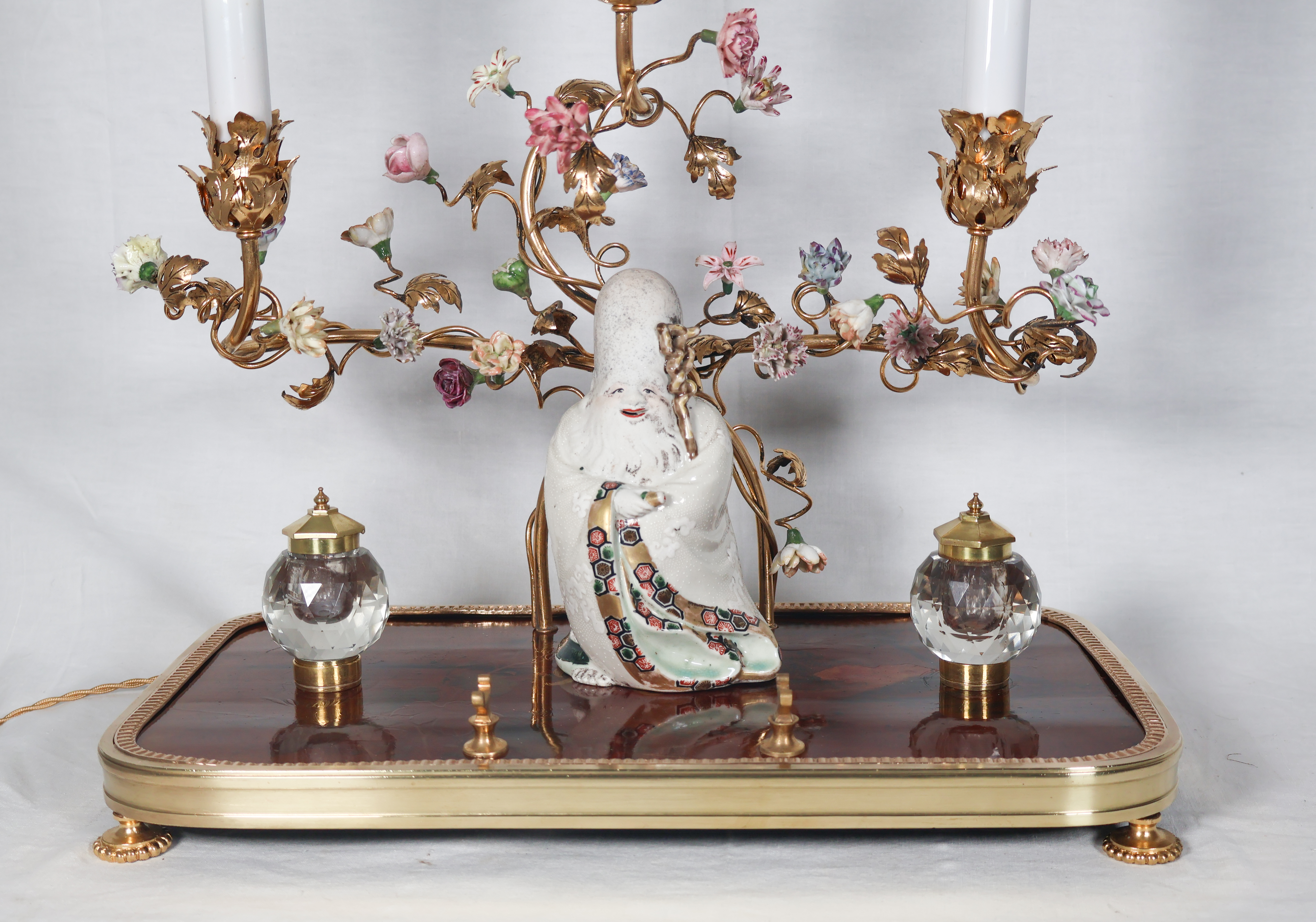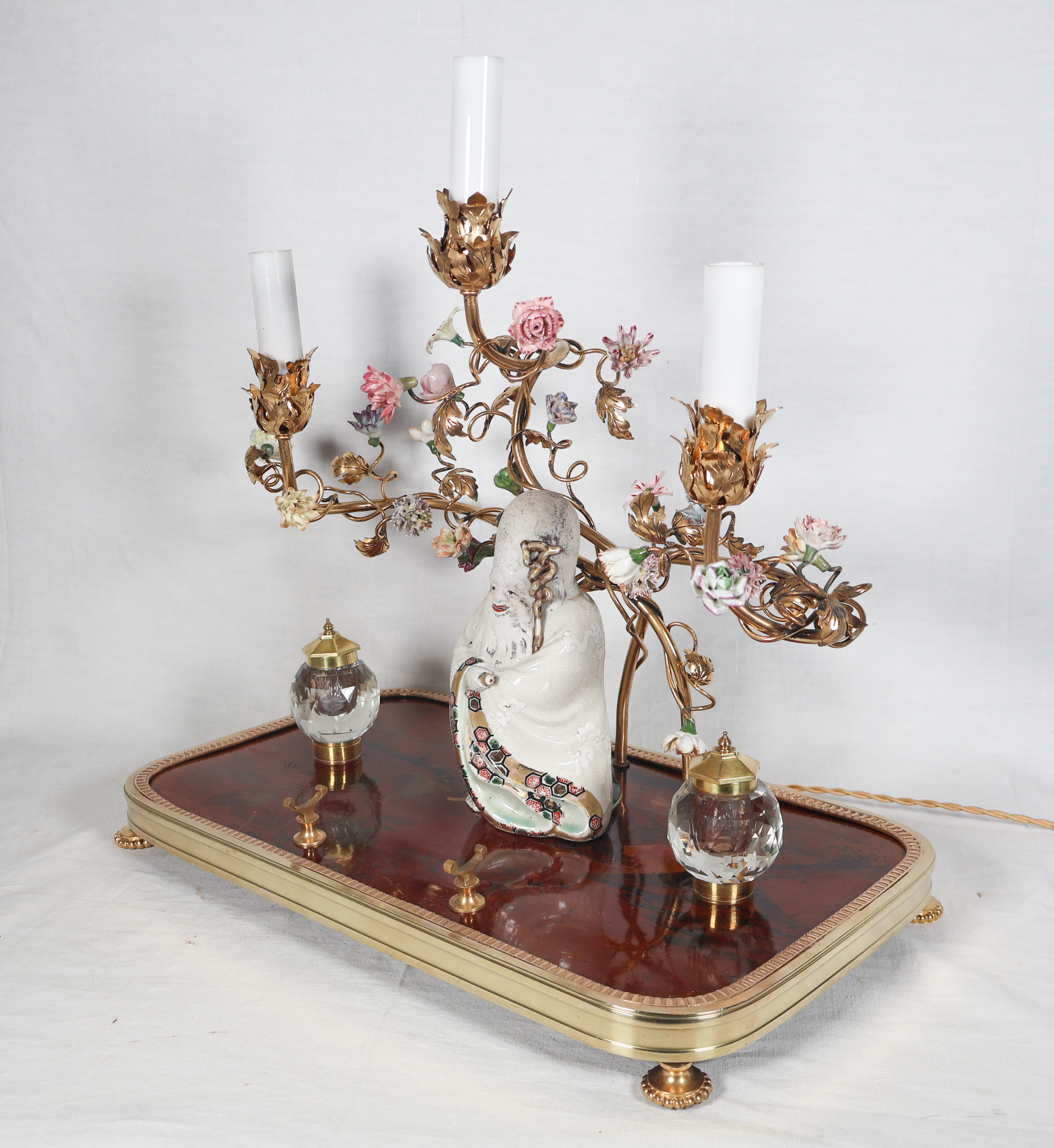 À trois bras de lumière avec caches-bougies en opaline, ornés de fleurs en porcelaine et soutenant au centre une figure de sage japonais en porcelaine polychrome.