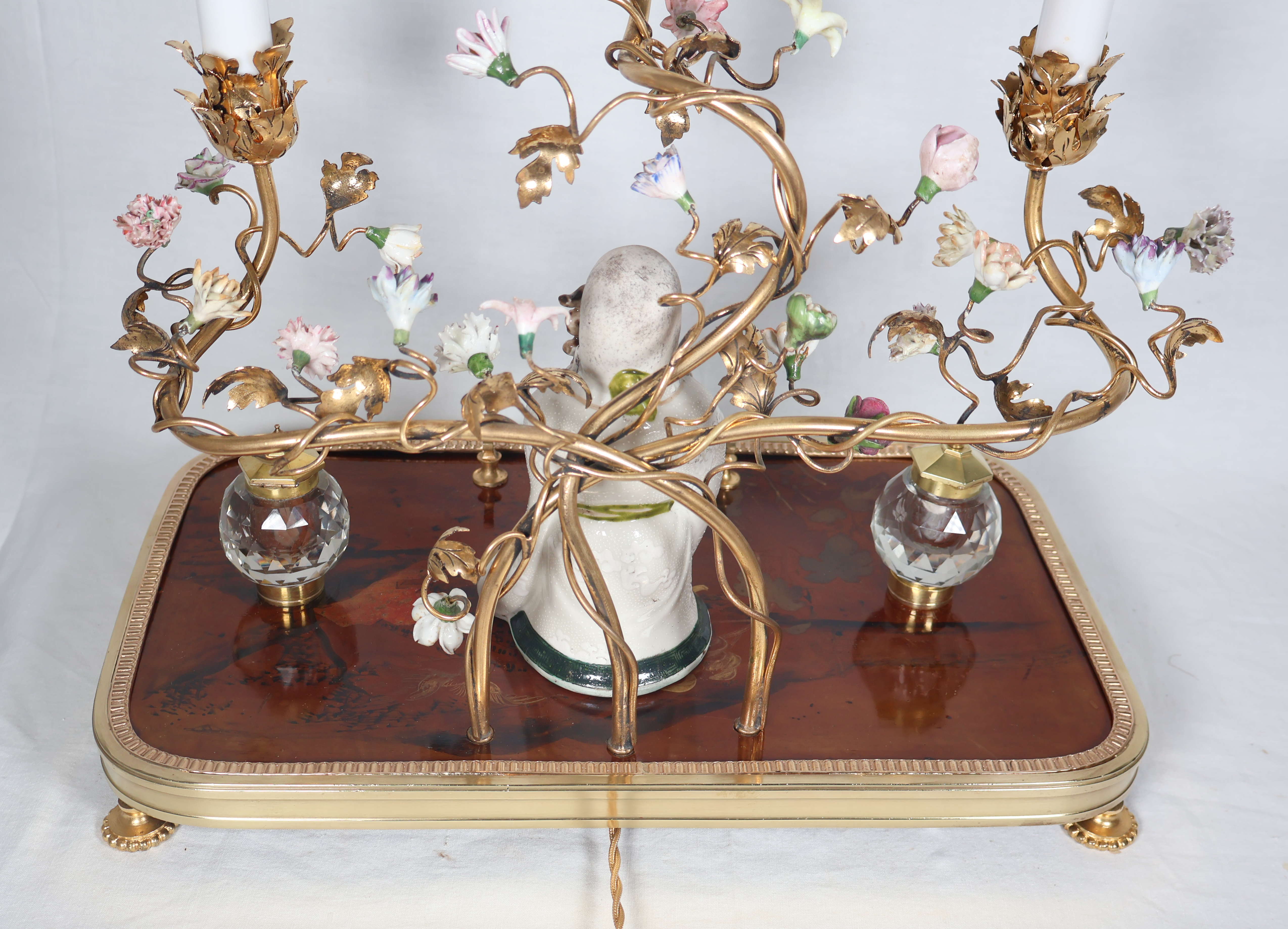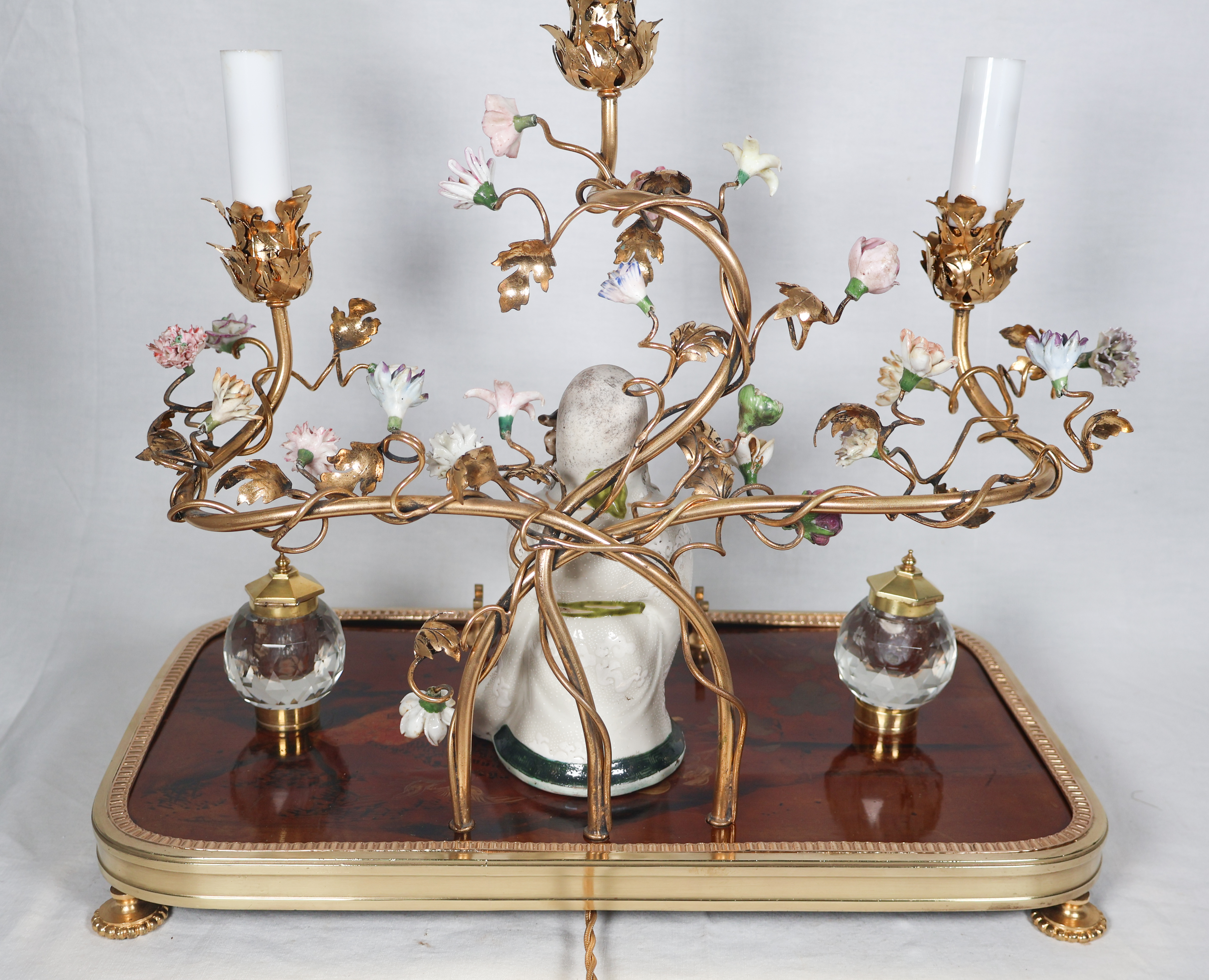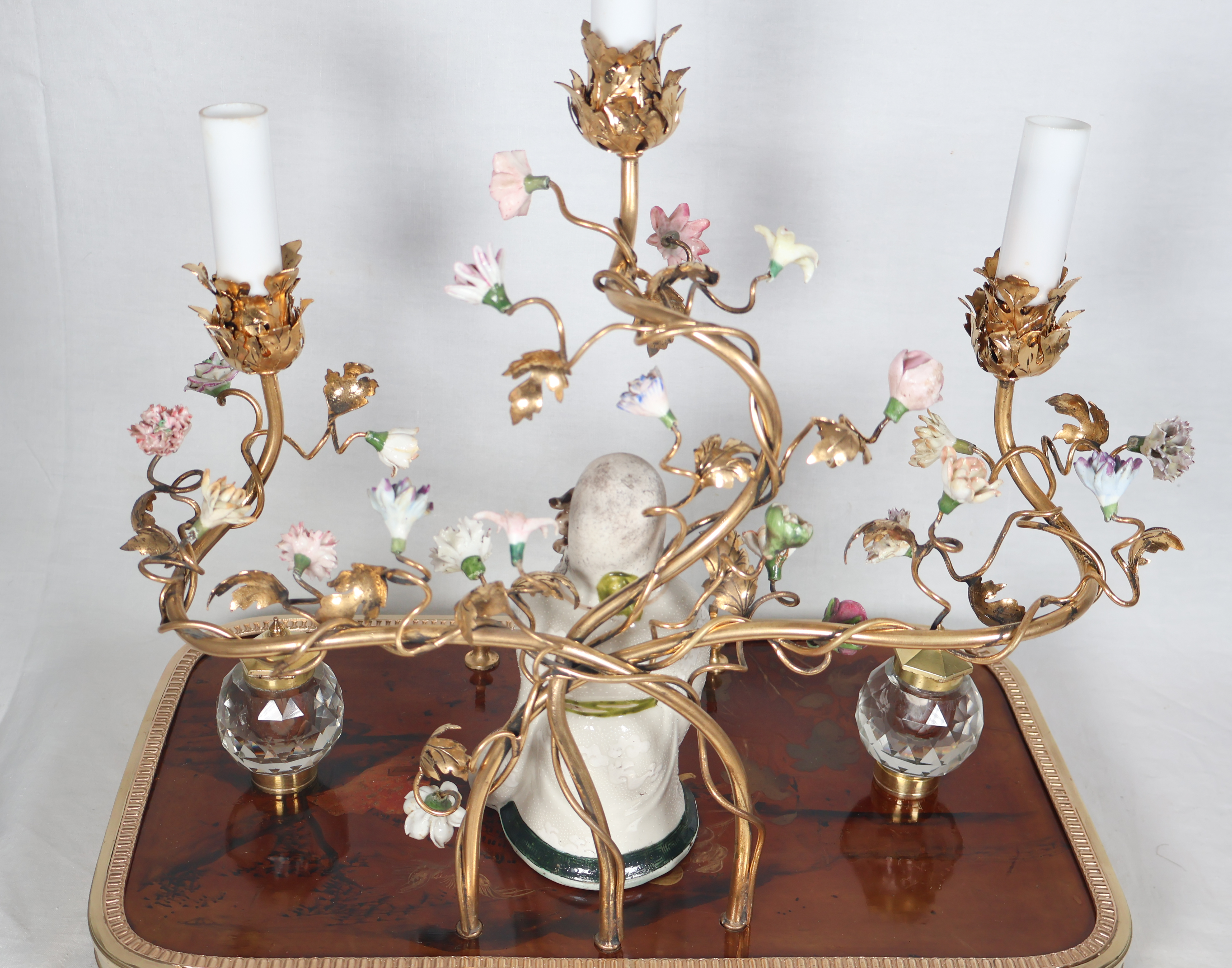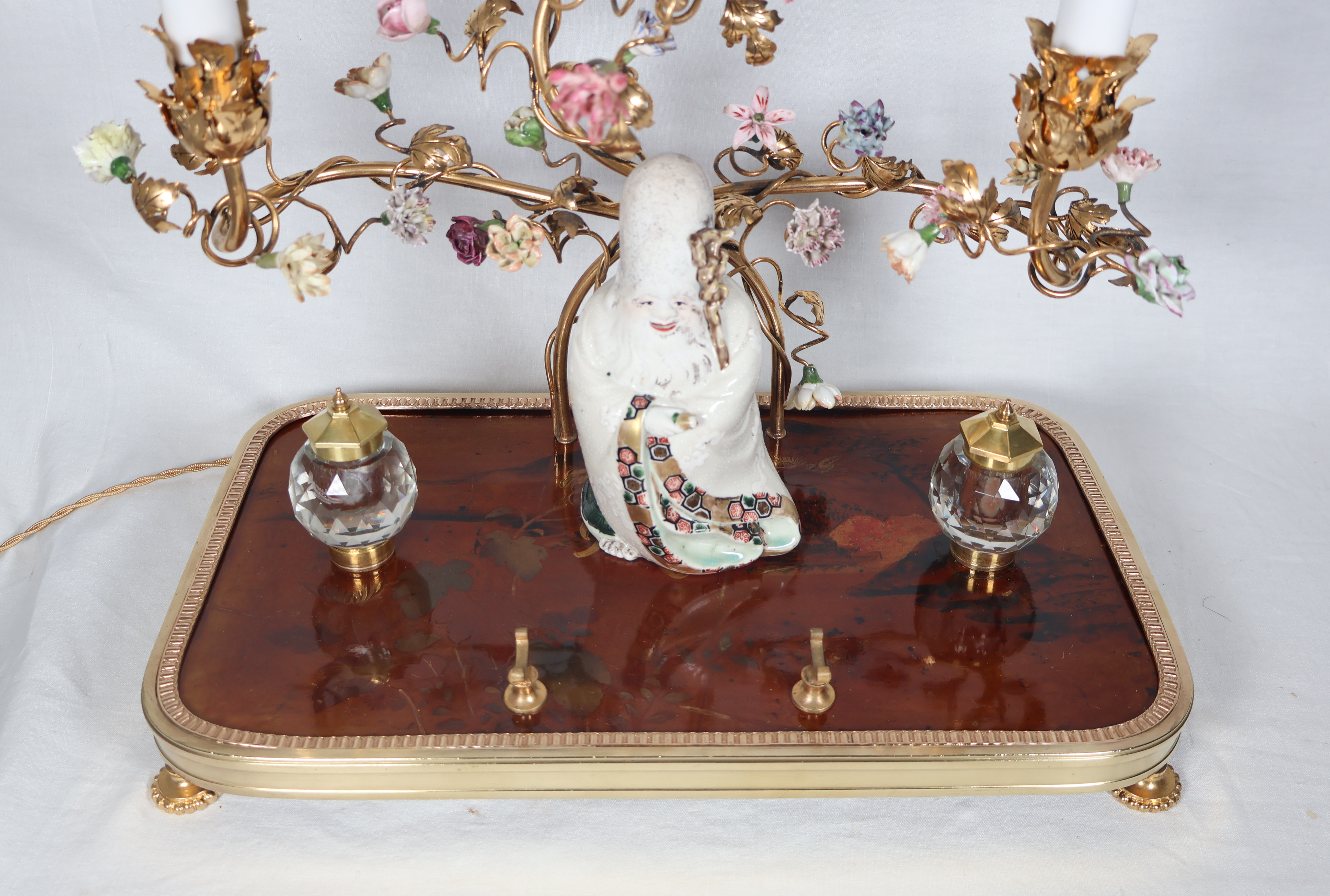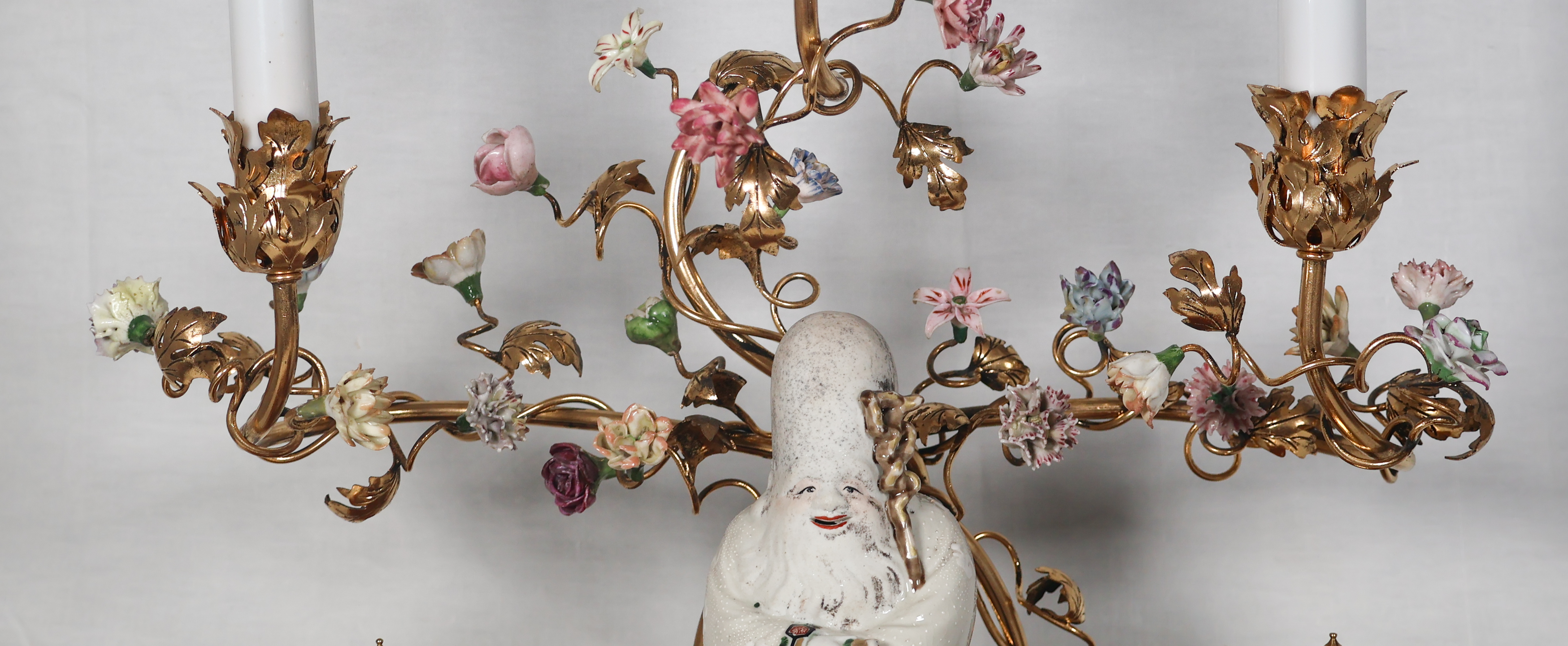 À trois bras de lumière avec caches-bougies en opaline, ornés de fleurs en porcelaine et soutenant au centre une figure de sage japonais en porcelaine polychrome.