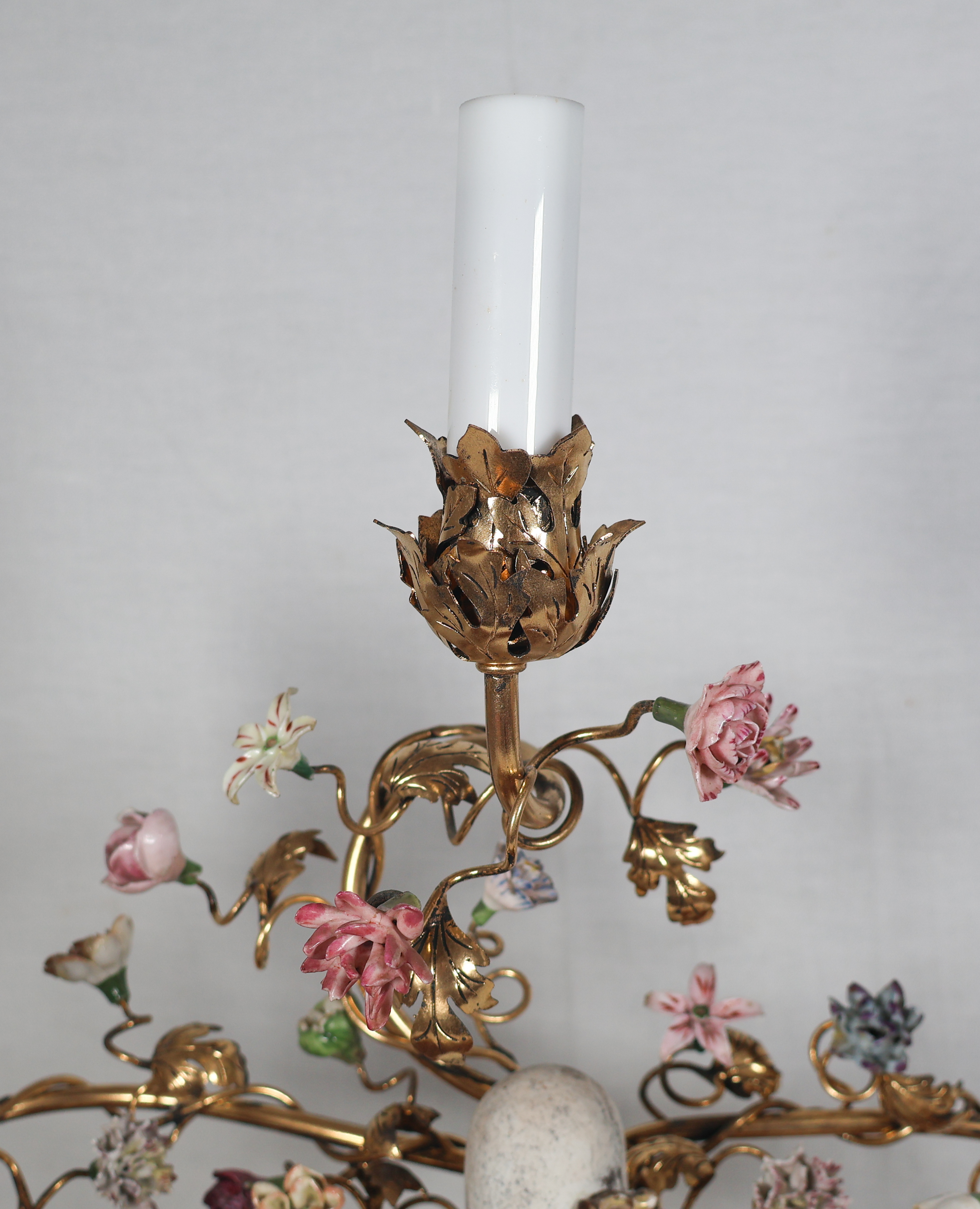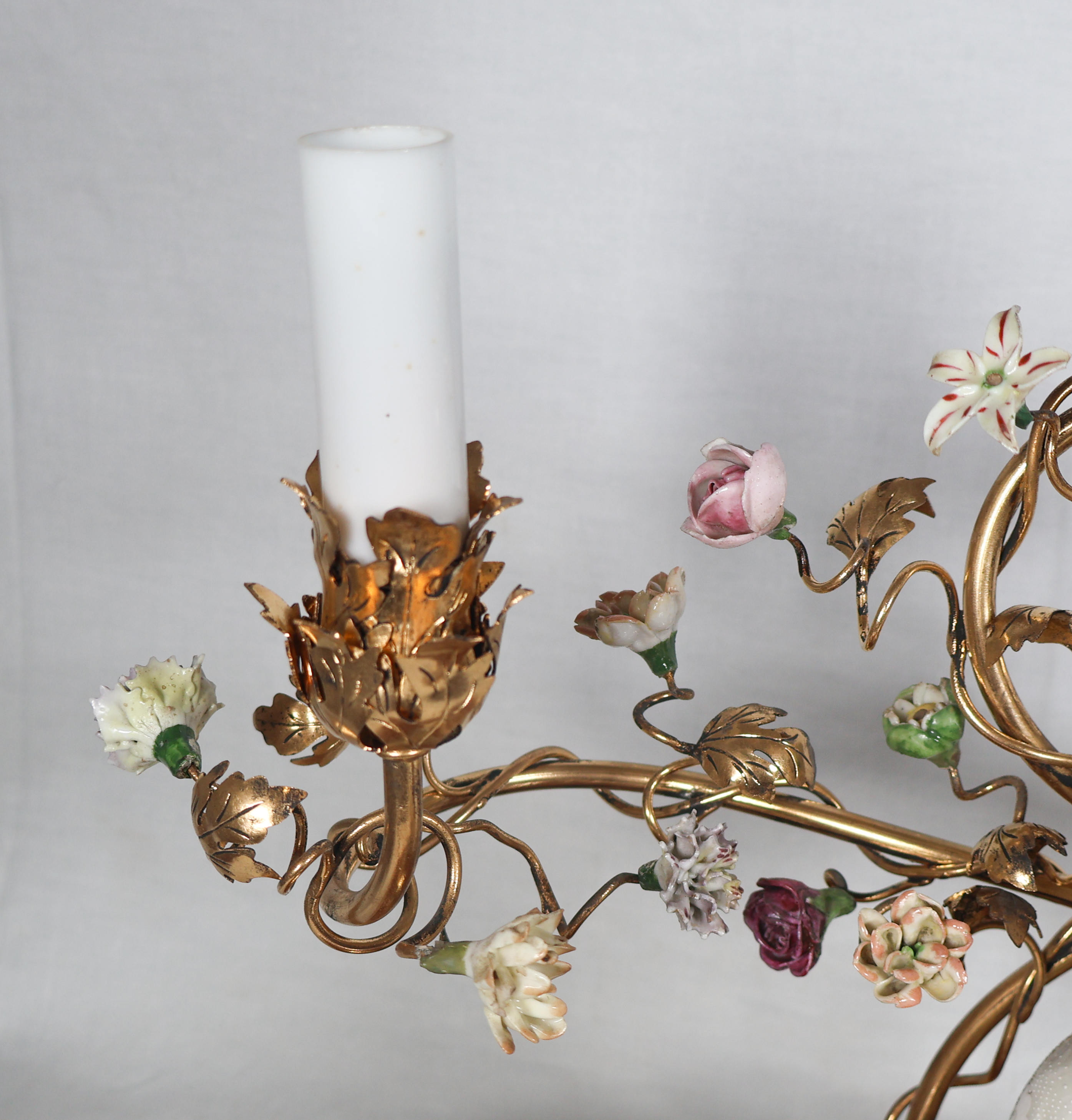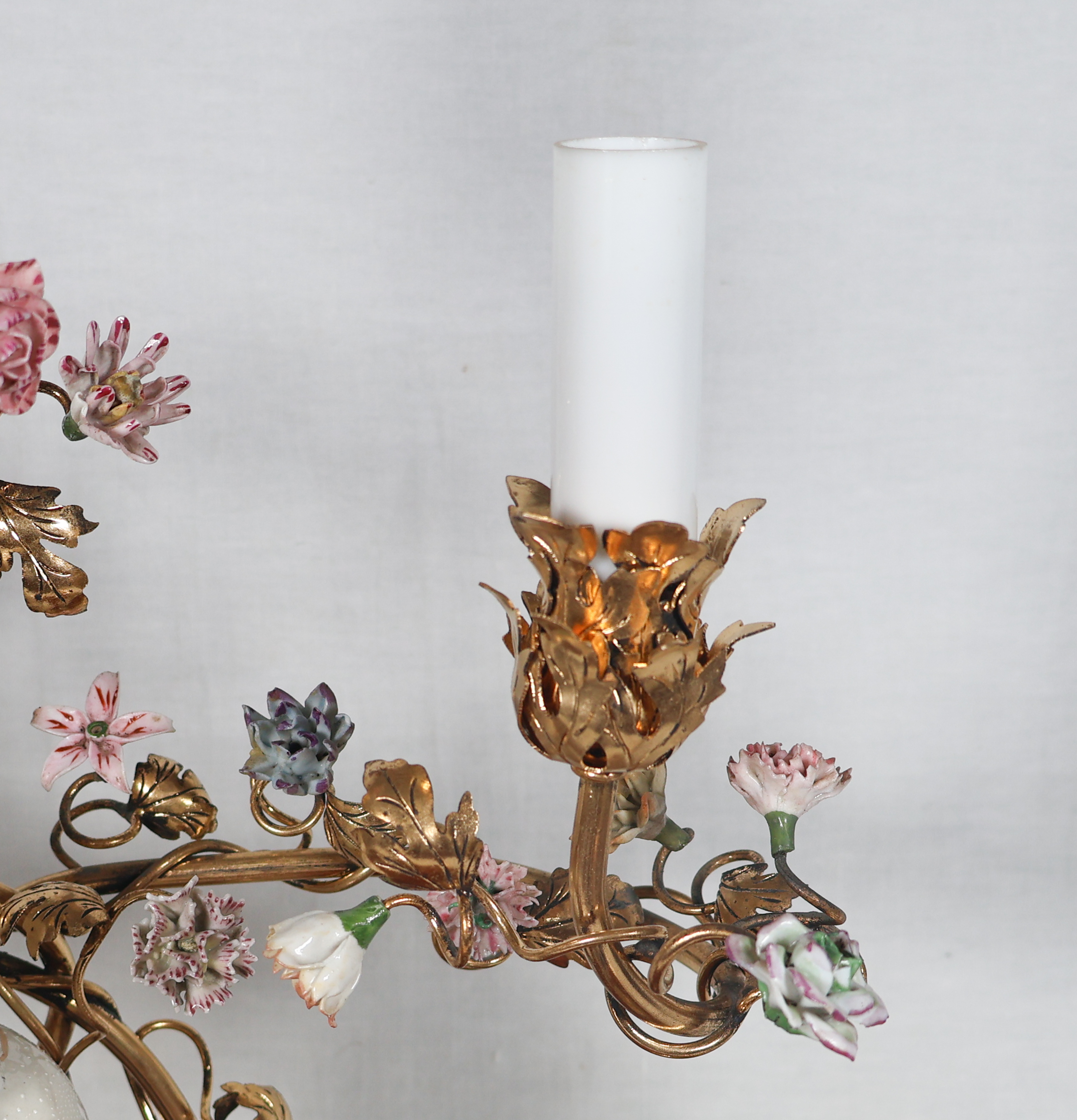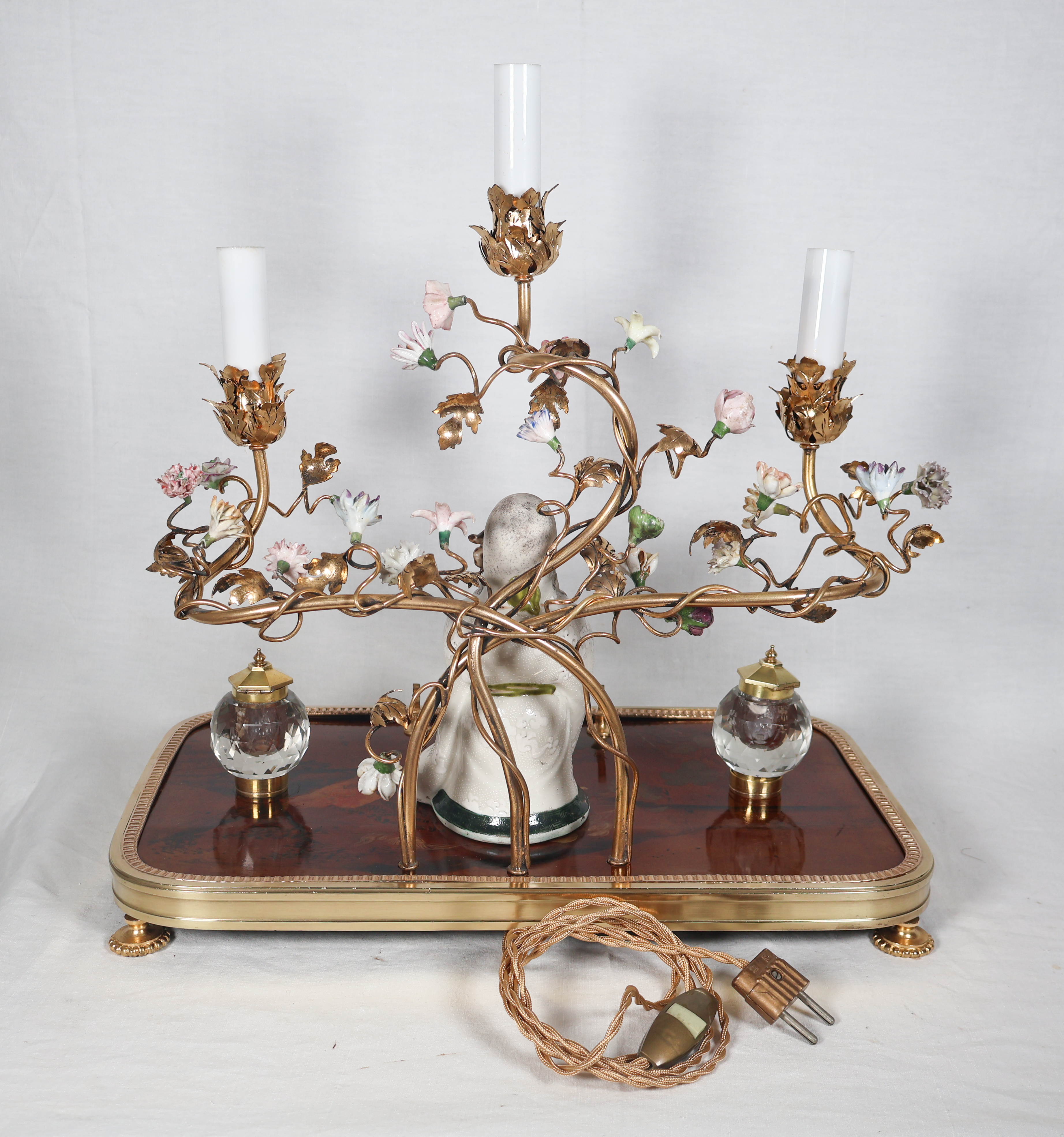 À trois bras de lumière avec caches-bougies en opaline, ornés de fleurs en porcelaine et soutenant au centre une figure de sage japonais en porcelaine polychrome.