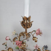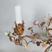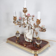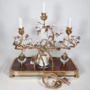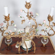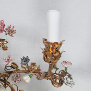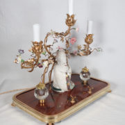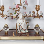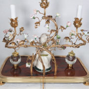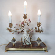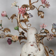 À trois bras de lumière avec caches-bougies en opaline, ornés de fleurs en porcelaine et soutenant au centre une figure de sage japonais en porcelaine polychrome.