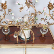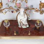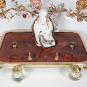 Deux encriers latéraux en cristal à montures en bronze doré sont intégrés au plateau.