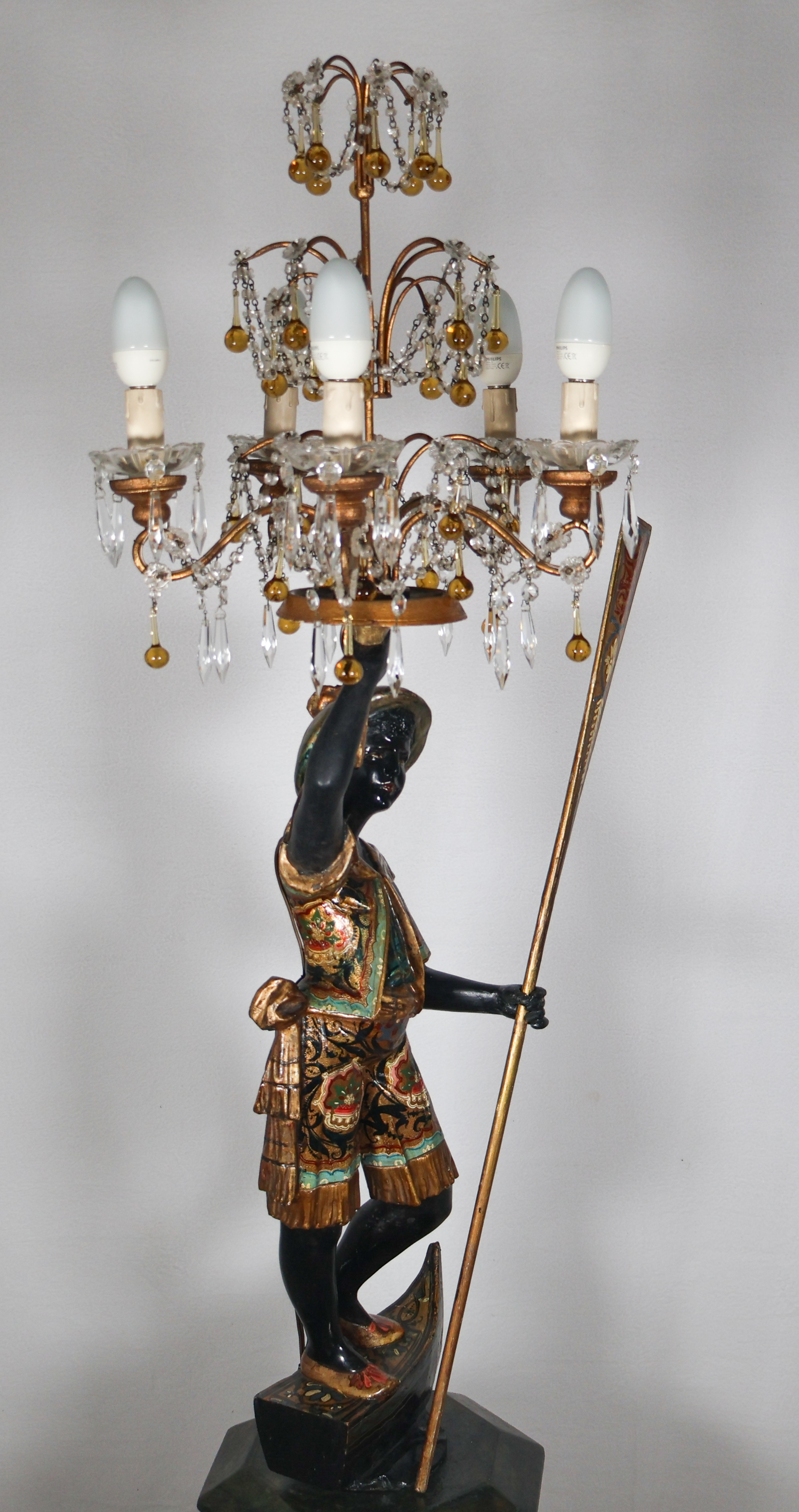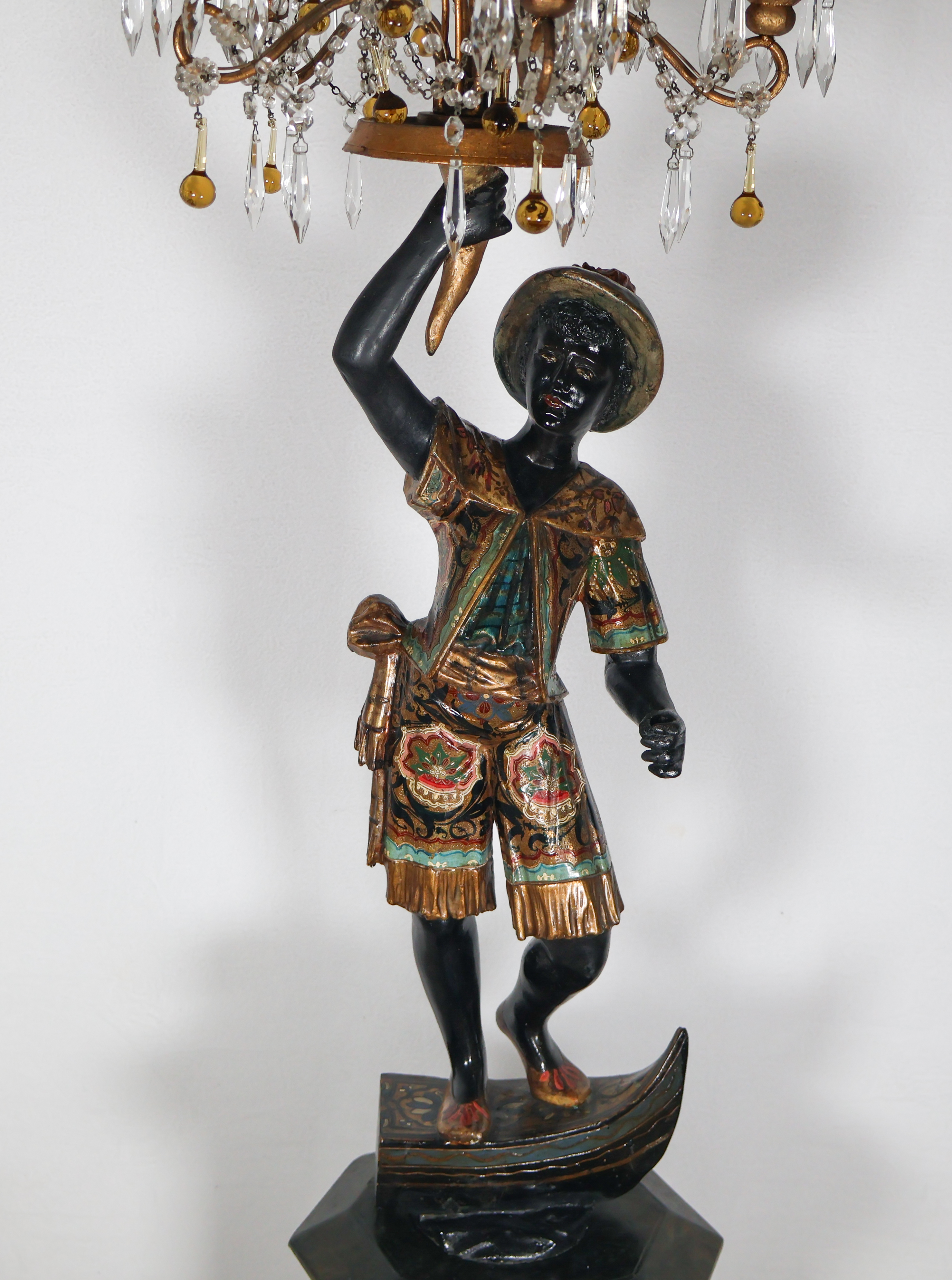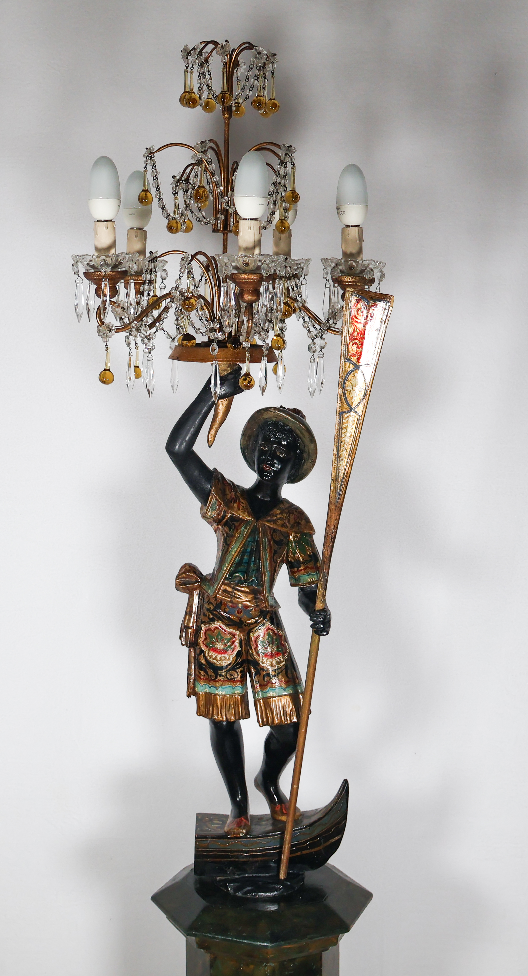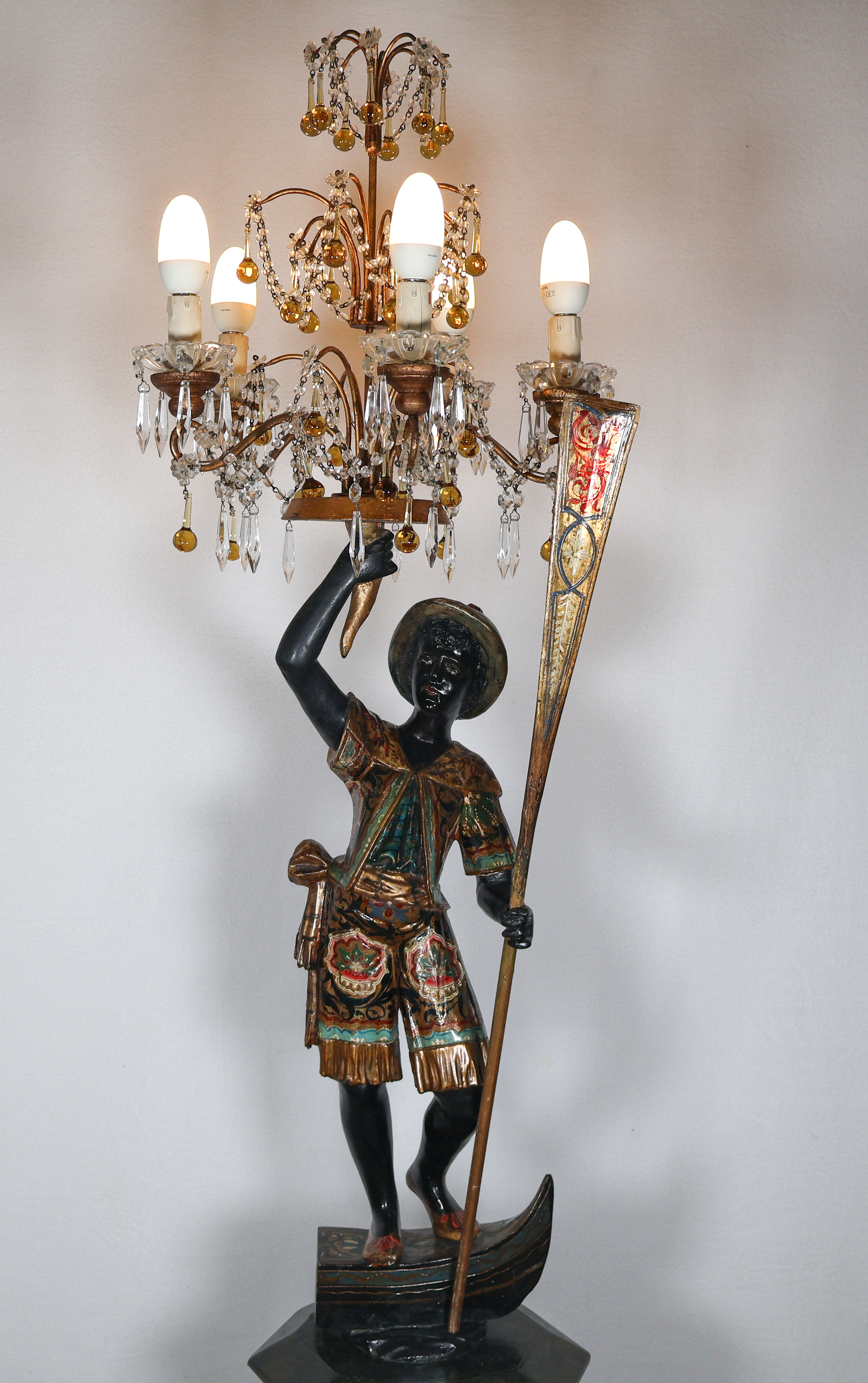 La figure représente un gondolier debout, un bras levé tenant un candélabre orné de pampilles, l’autre tenant une rame.