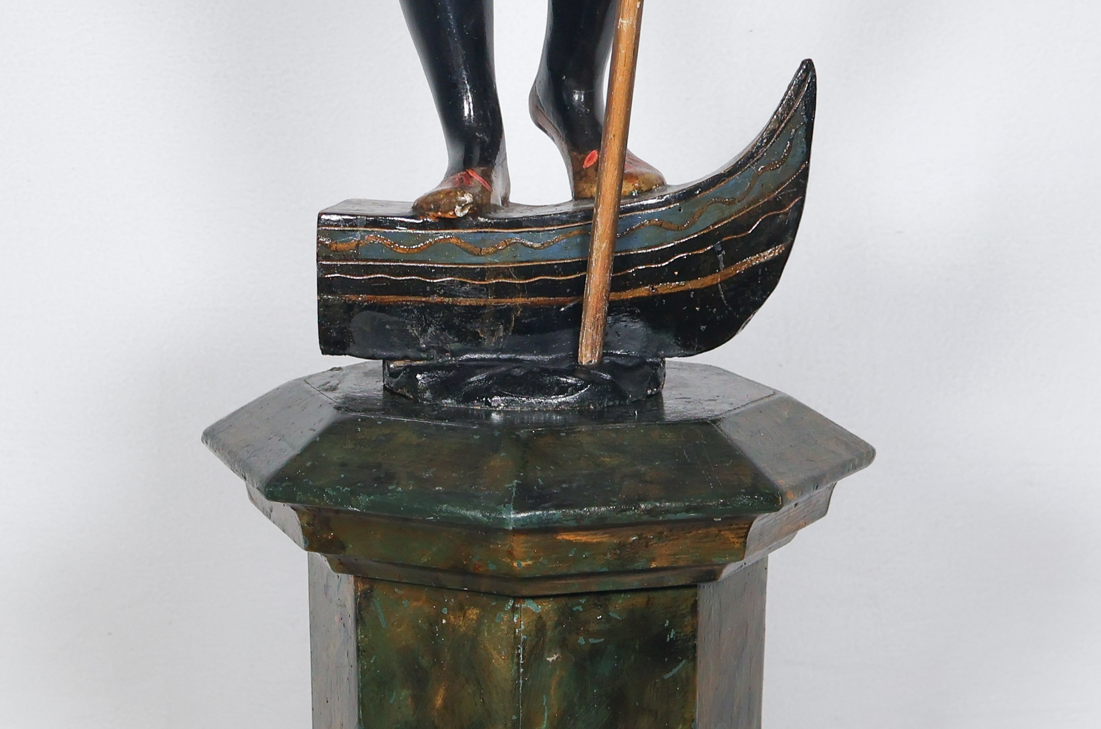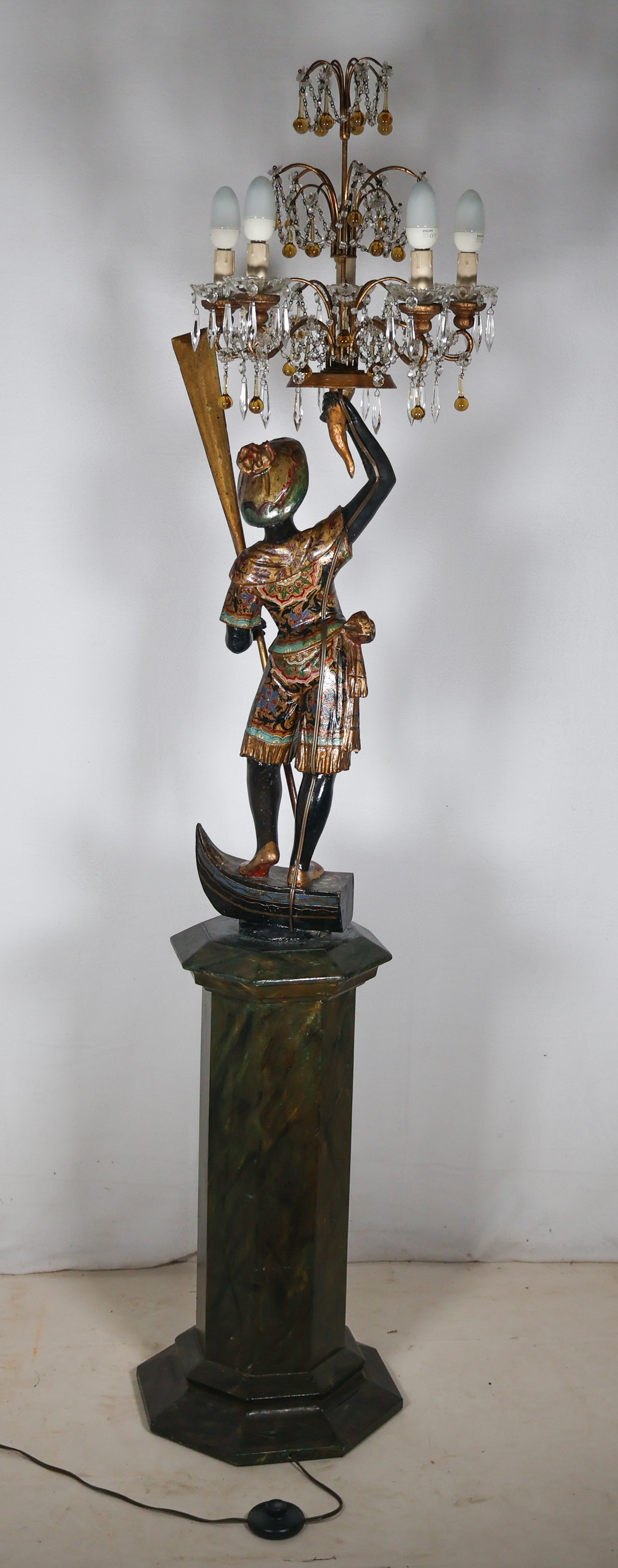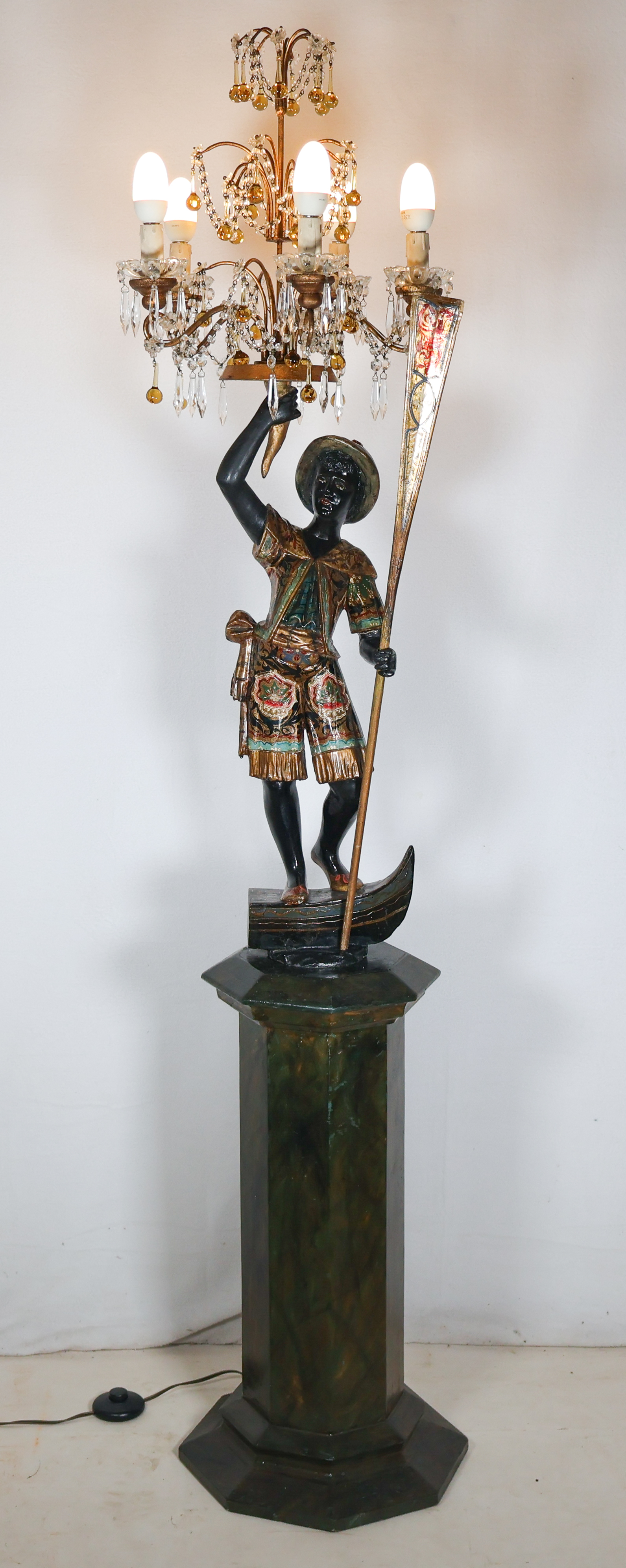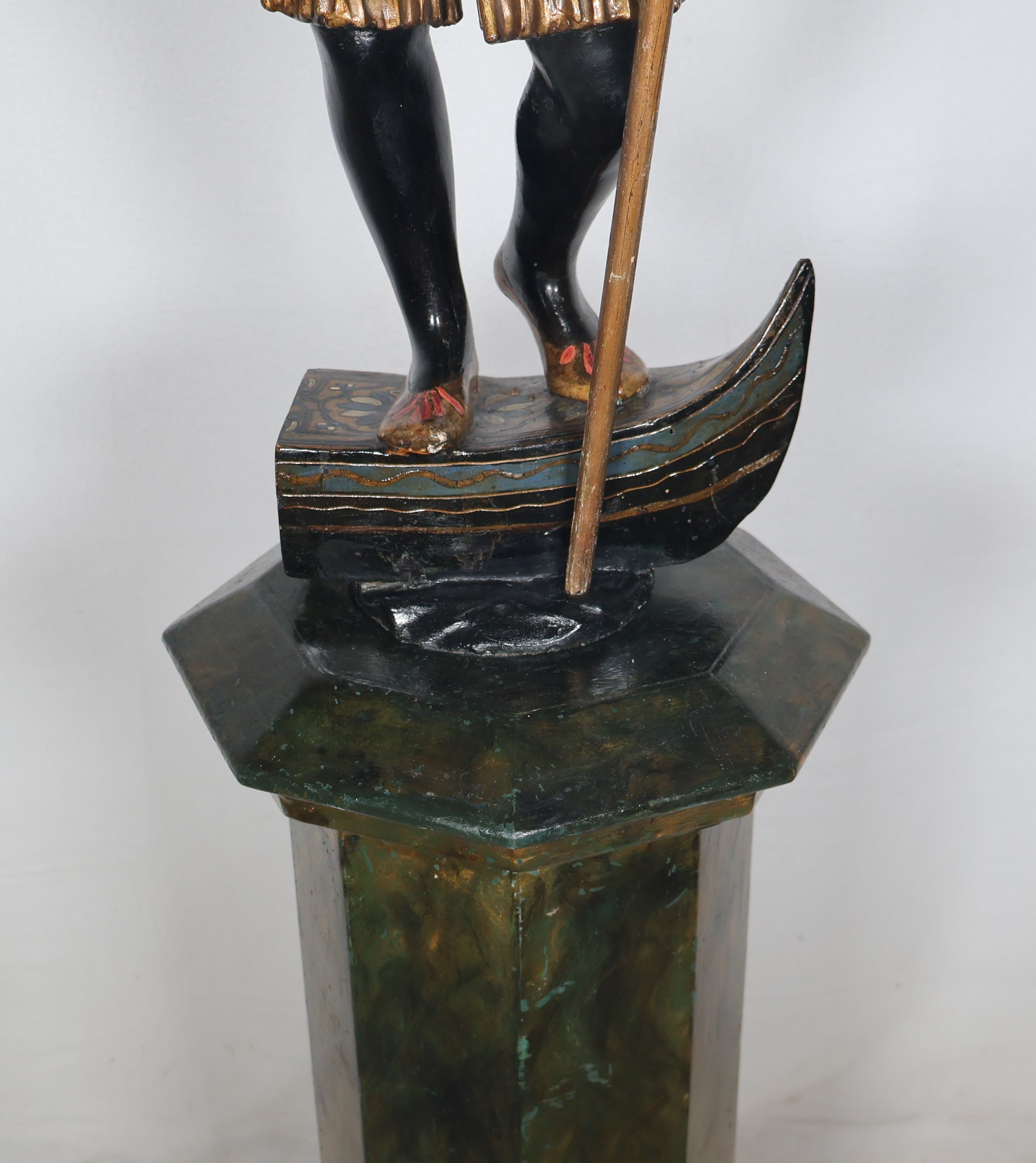 La figure représente un gondolier debout, un bras levé tenant un candélabre orné de pampilles, l’autre tenant une rame.
