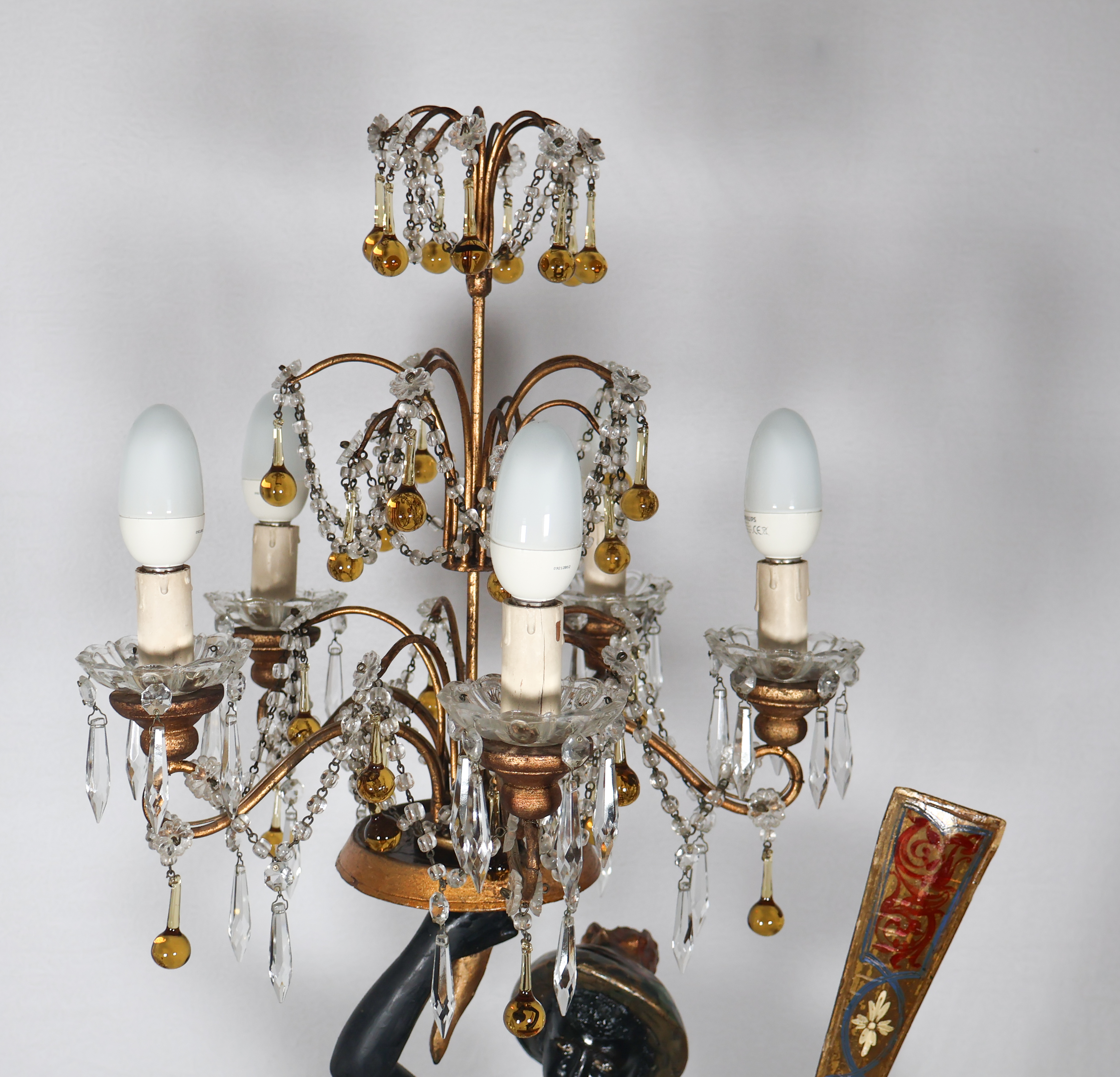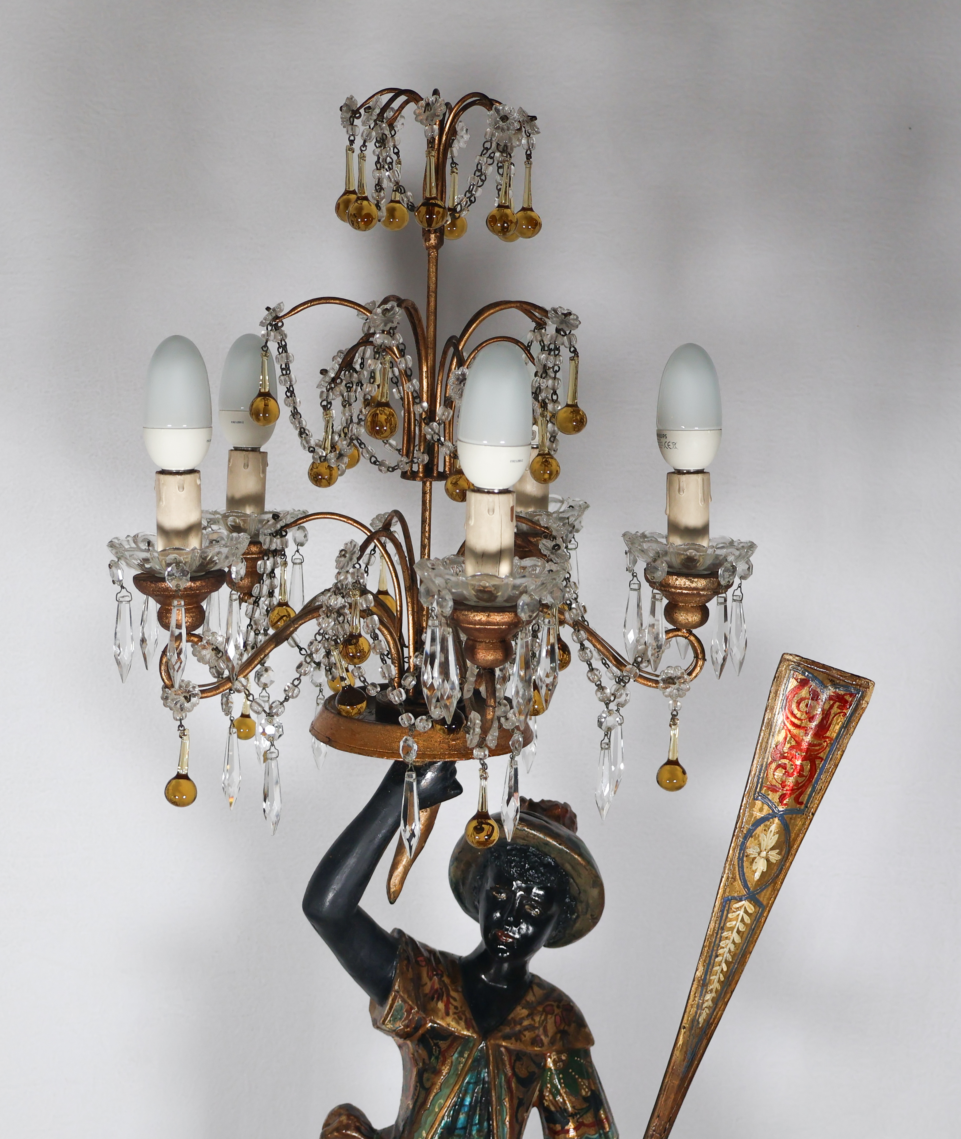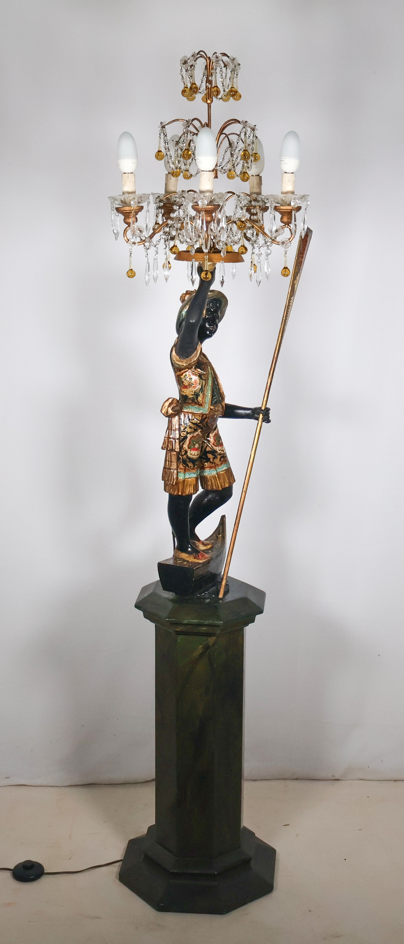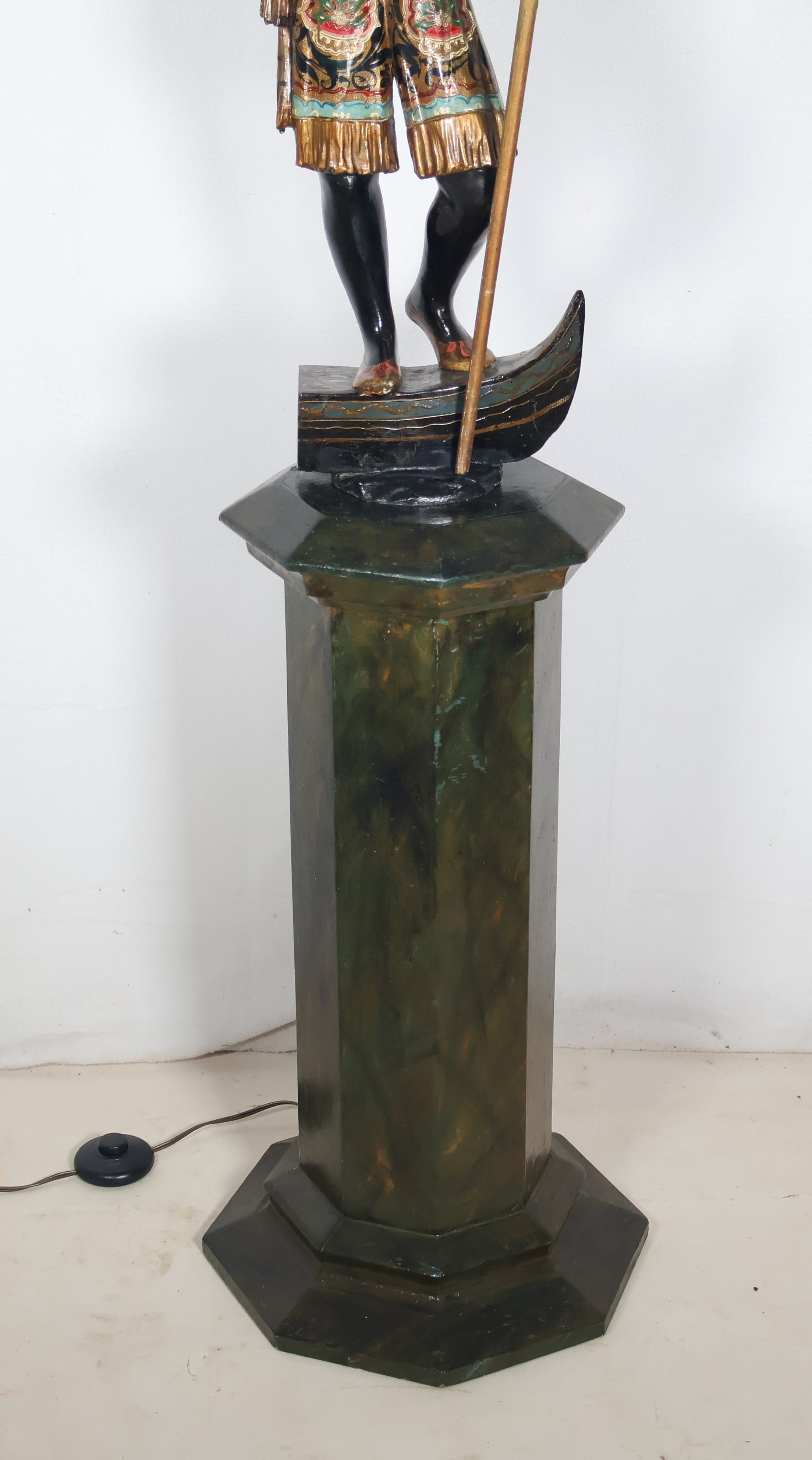 La figure représente un gondolier debout, un bras levé tenant un candélabre orné de pampilles, l’autre tenant une rame.
