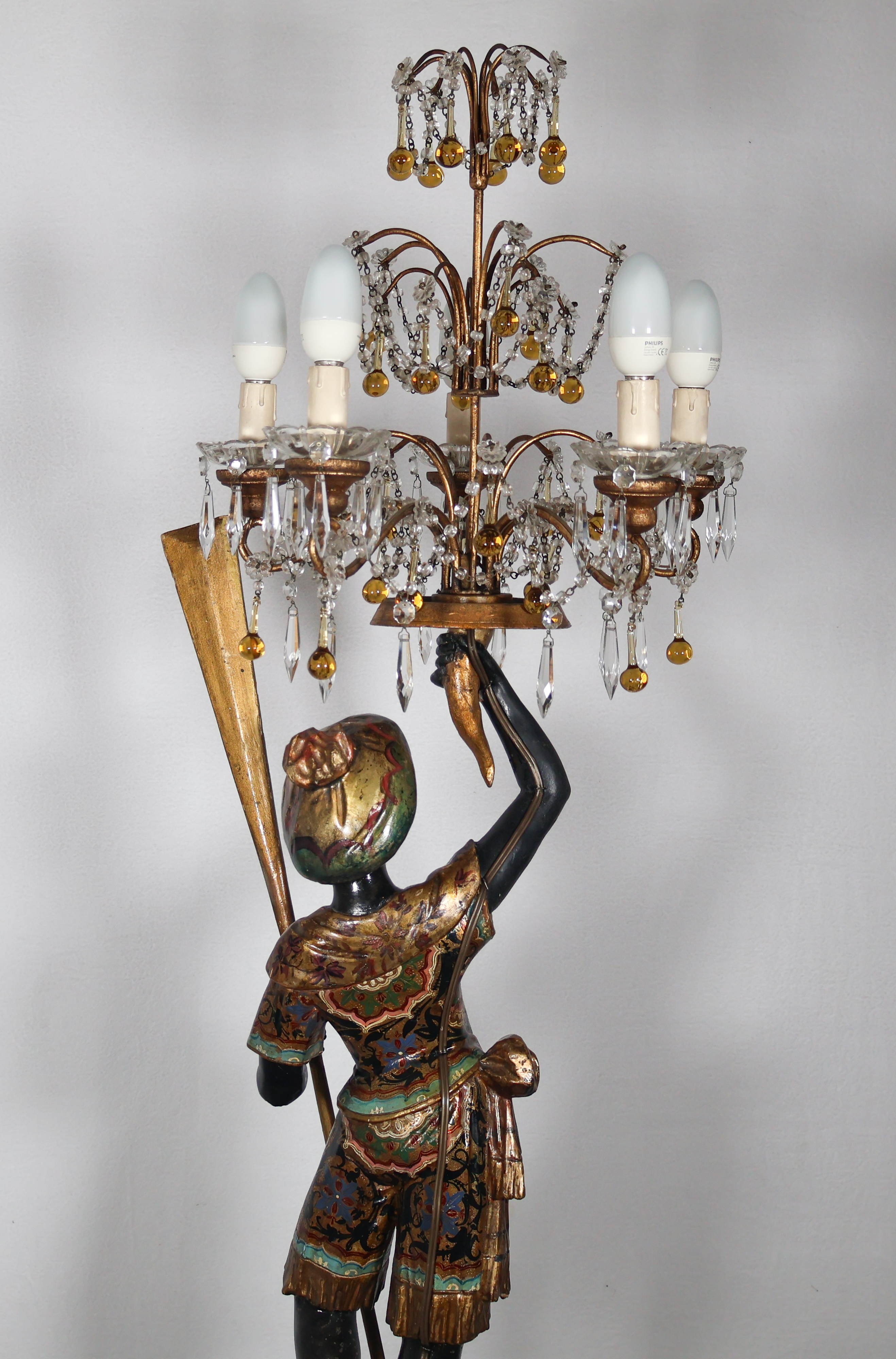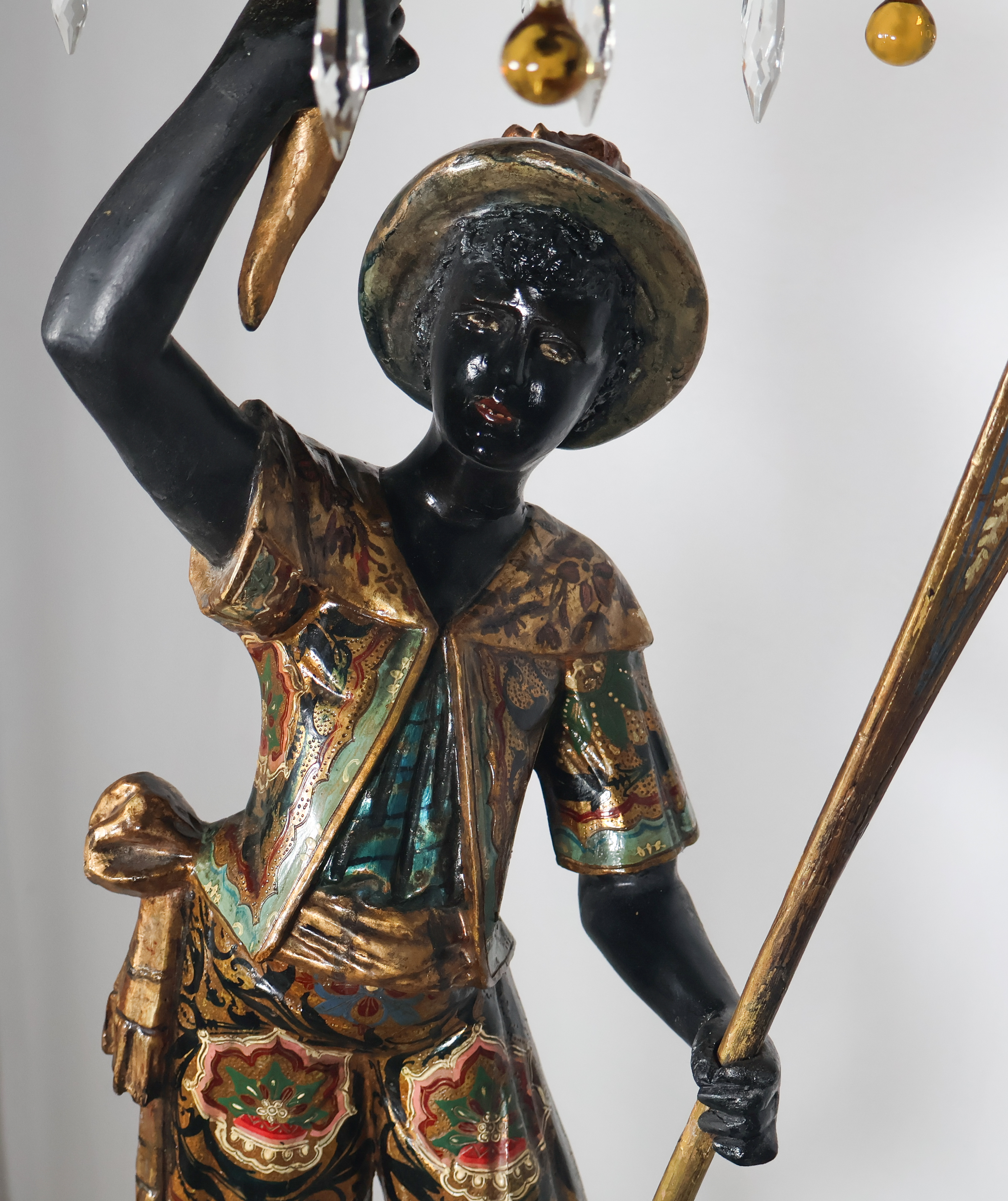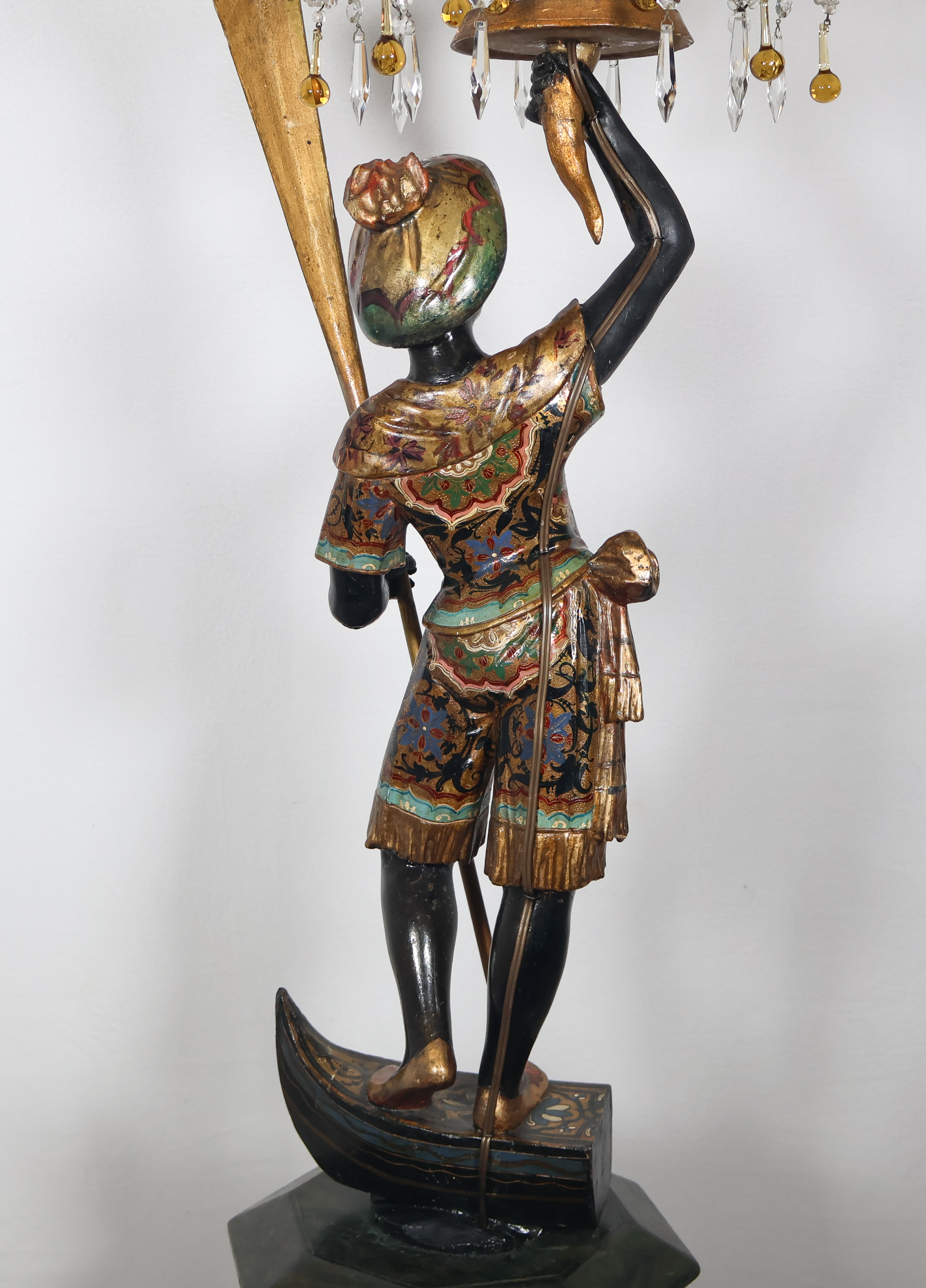 Nubien porte-torchère en bois sculpté et laqué noir, décoré de vêtements polychromes et dorés, travail vénitien de la fin du XIXᵉ siècle.