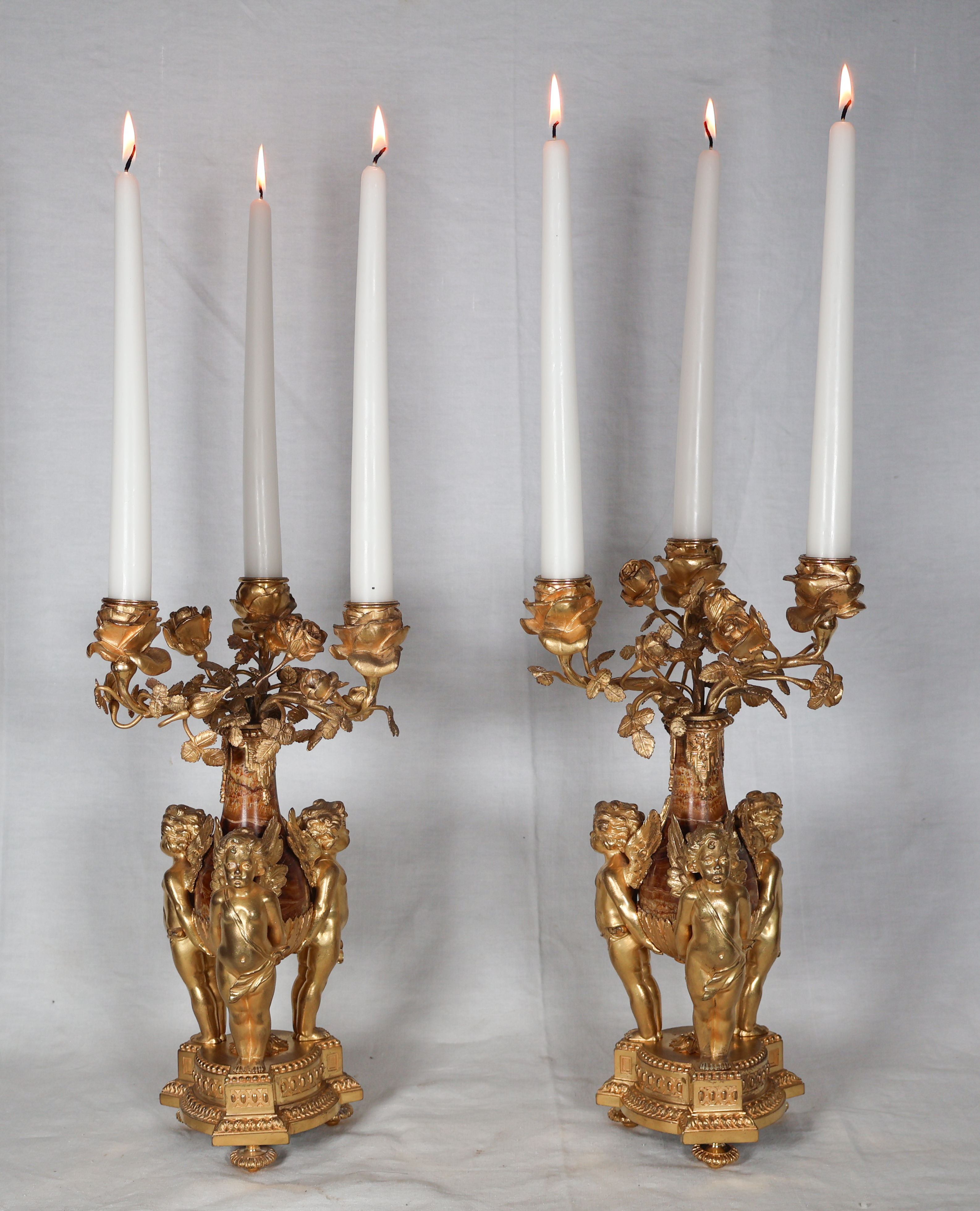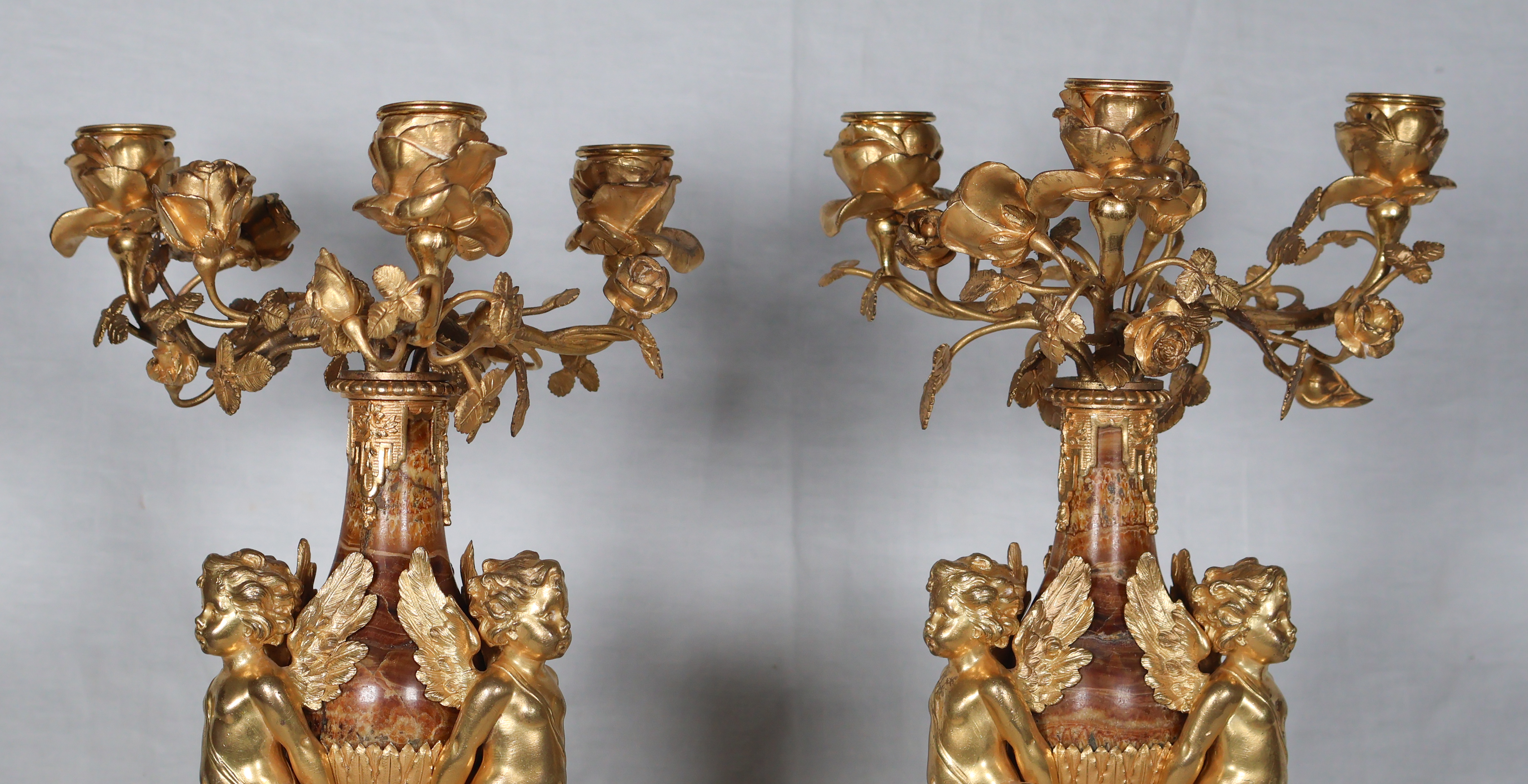 Chaque pièce présente trois putti ailés soutenant un vase en marbre brèche violette surmonté d’un bouquet de roses formant trois bras de lumière.