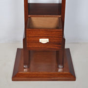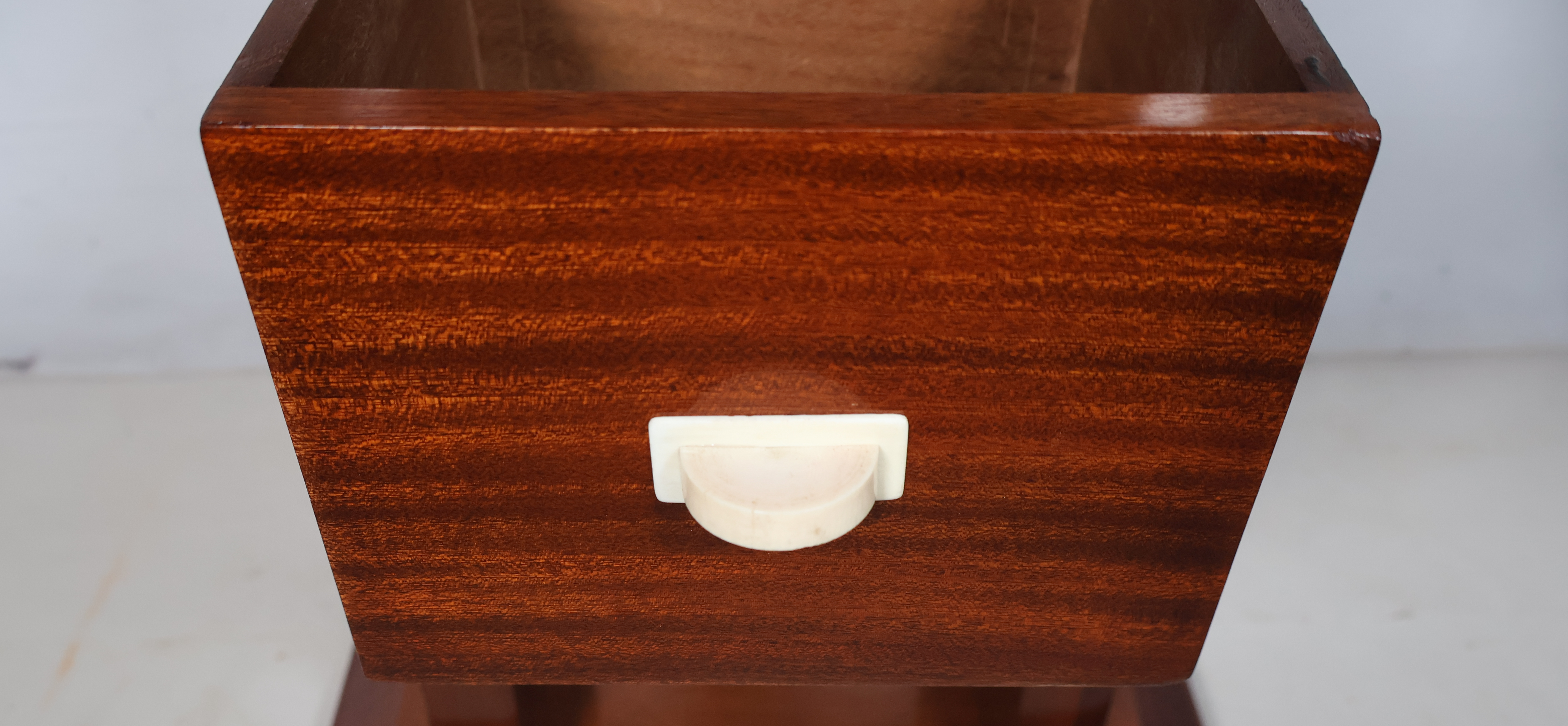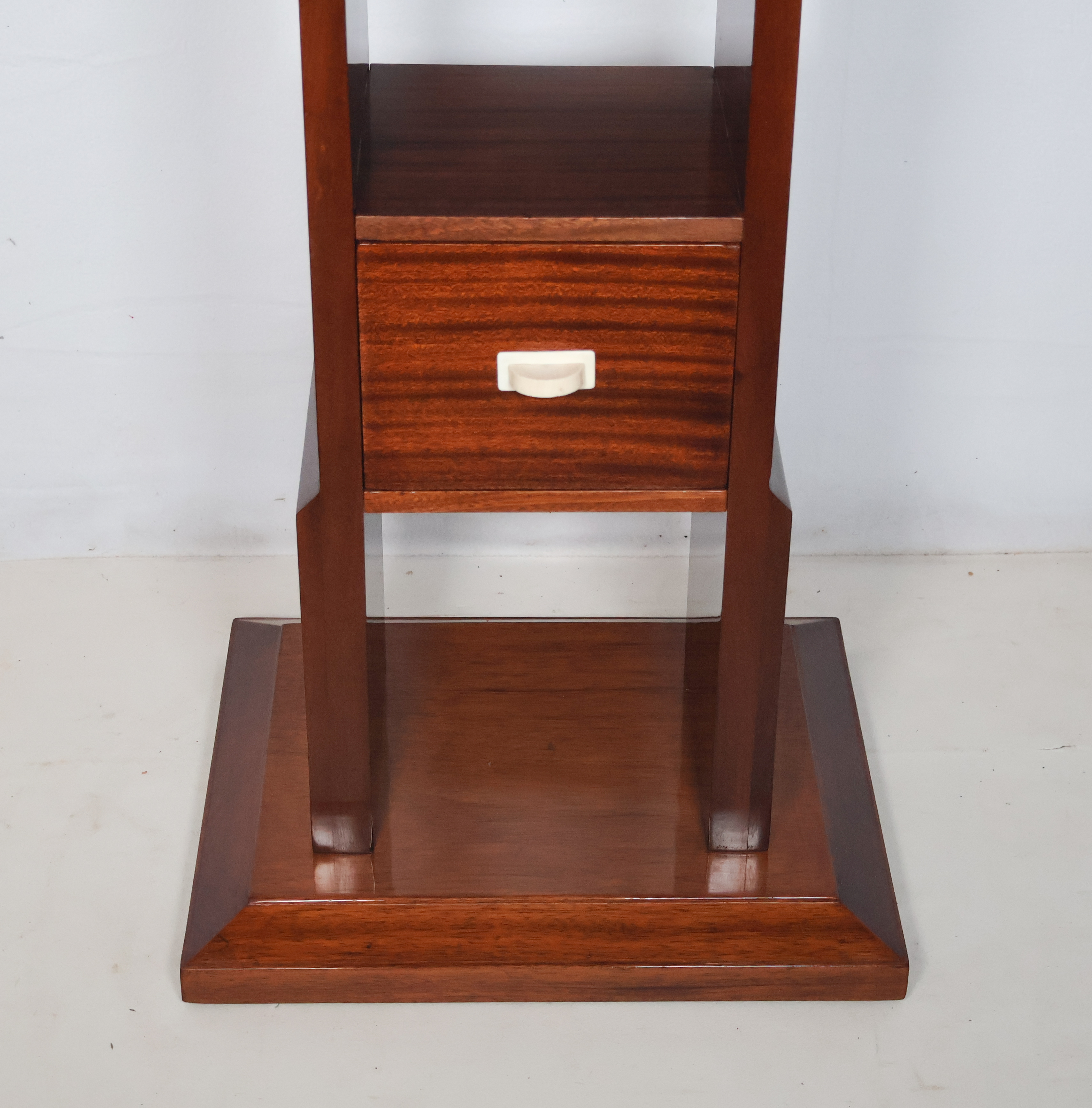 L’ensemble repose sur un fût carré intégrant un tiroir muni d’un bouton de tirage en ivoire, le tout sur un socle carré.