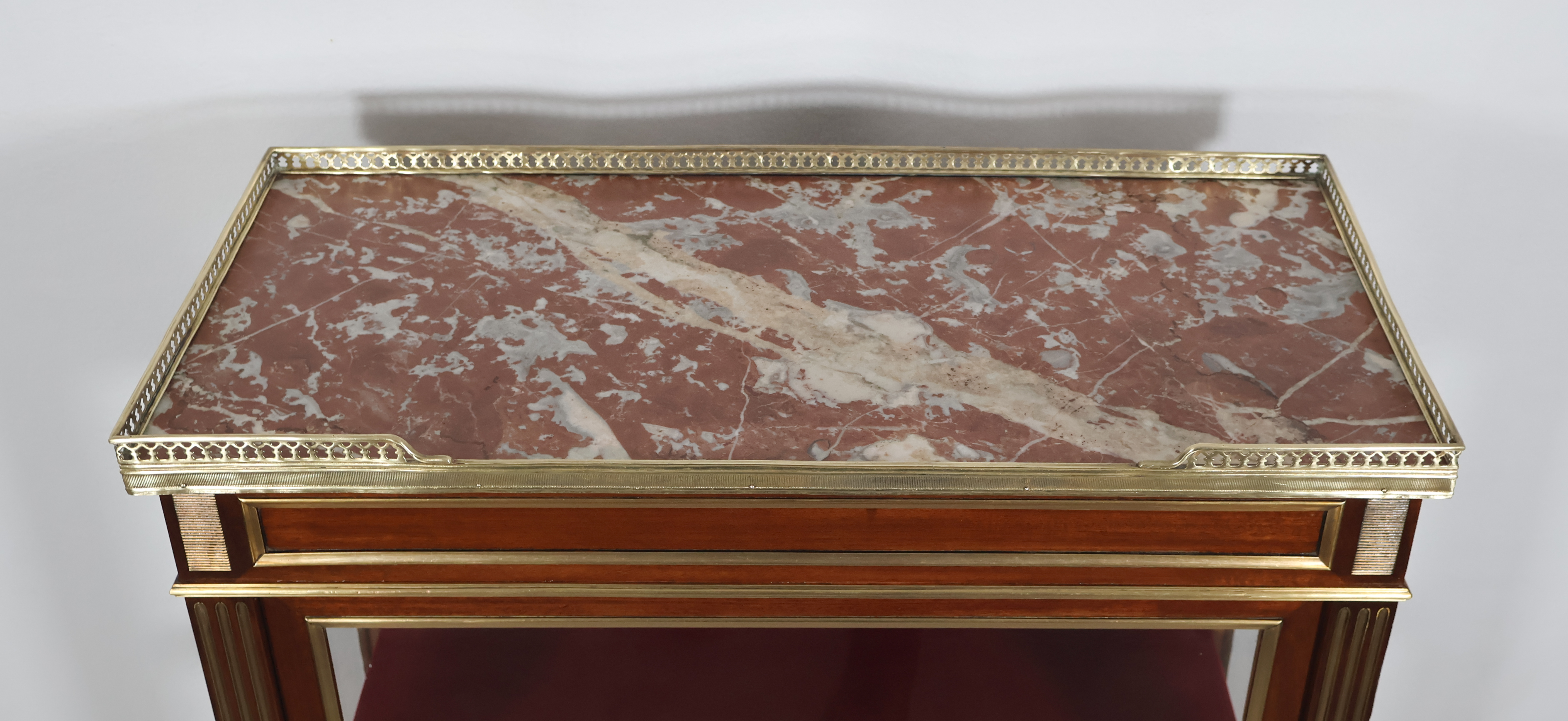 Dessus en marbre rouge des Pyrénées ceint d’une galerie en laiton doré et ajouré,